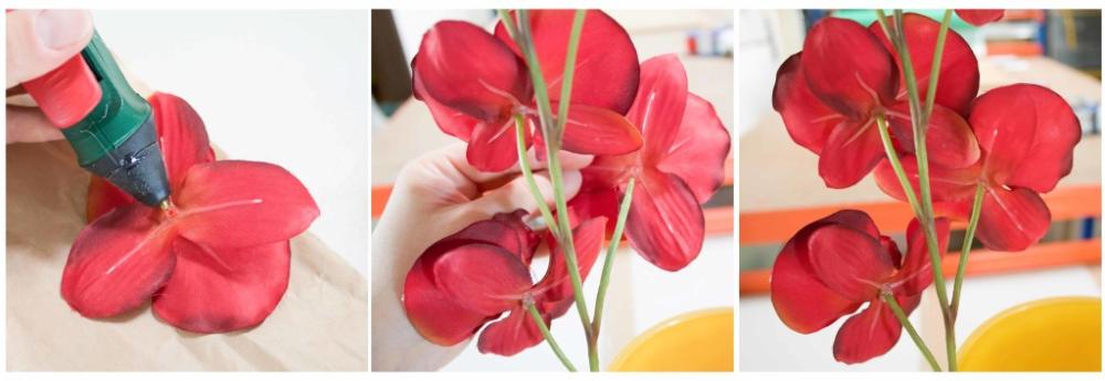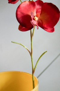 Unser Reparatur Beispiel Nummer 1 ist ein künstlicher Orchideenzweig. Hier kann eine Blüte beim zurechtbiegen schonmal ihren Halt verlieren. Das ist dann kein Zeichen für schlechte Qualität, sondern hängt oftmals damit zusammen, wie empfindlich der Stoff der Blüte ist. Doch das Problem ist leicht zu beheben. Wenn möglich kann die Blüte entweder einfach wieder zurück gesteckt werden und wer ganz sicher gehen möchte, kann mit ein wenig Heißkleber die Blüte richtig fixieren.