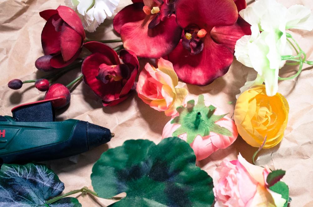 Was sollte euer Kunstpflanzen Erste-Hilfe-Koffer beinhalten? Oft nicht mehr als eine Heißklebepistole, etwas Draht und ein wenig Geduld. Warum reparieren wir unsere Kunstpflanzen mit der Heißklebepistole und nicht einem beliebigen Sekundenkleber? Wer schonmal mit Sekundenkleber gearbeitet hat, kennt sicher den Augenblick, wenn die Finger plötzlich aneinander kleben oder die Tischdecke an der reparierten Blumenvase festhängt. Sekundenkleber bleibt seinem Namen treu und ein schnelles Arbeiten ist nötig, um die volle Klebkraft ausnutzen zu können. Leider kann er auch hässliche Flecken auf den Seidenblüten hinterlassen.