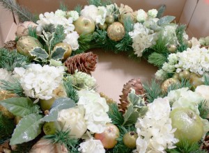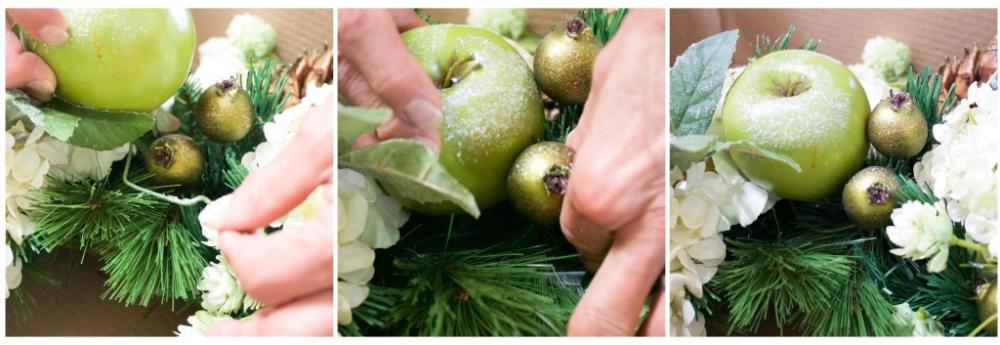 Doch nicht alles muss geklebt werden. Es gibt auch zahlreiche Kunstpflanzen Dekorationen, die nur mit Draht gesteckt werden. Unser großer Deko Kranz ist dafür ein gutes Beispiel. Ein künstlicher Apfel ist abgefallen. Auch hier kann Erste-Hilfe geleistet werden. Einfach den Apfel mit seinem Draht am Kranz wieder feststecken. Habt ihr Angst vor weiterem Fallobst? Dann dürft ihr natürlich etwas Heißkleber zusätzlich hinzugeben.
