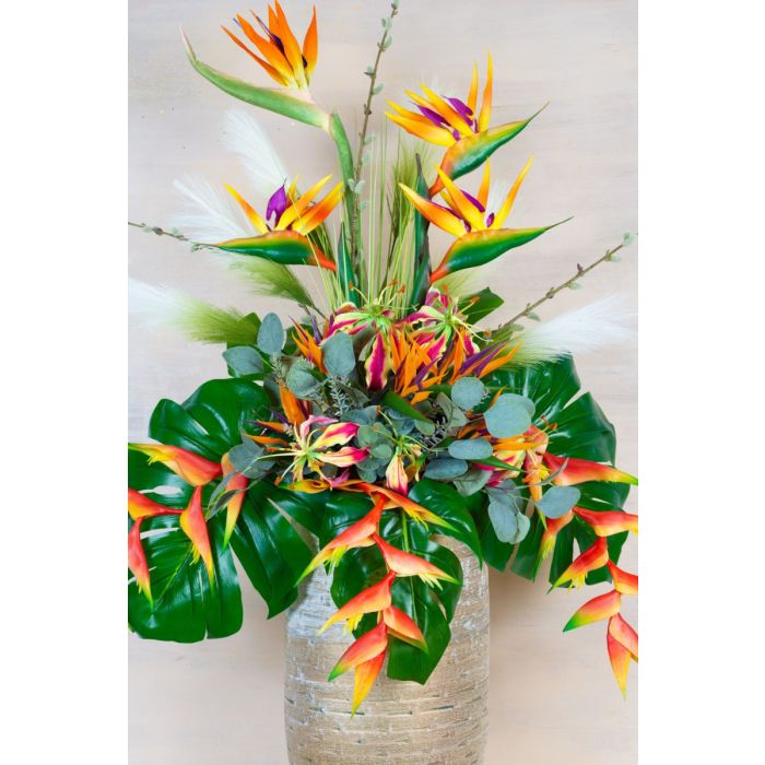 Modernes großes orange farbiges Bouquet! Für die Gestaltung eines Geschäftsraumes erhielten wir eine Anfrage von Bastian. Als Eckpunkte hatten wir den Farbwunsch sowie die gewünschten Maßangaben des Straußes. Ein Bild vom Raum sowie von der für den Blumenstrauß vorgesehenen Amphore, sollte uns dabei helfen eine passende Auswahl an Blumen zu treffen. Wir hatten also freie Hand und konnten uns kreativ im Orangenen Farbspektrum ausleben. Der Raum selbst wirkte durch den anthrazit farbigen Boden und einigen verchromten Elementen sehr clean und kühl. Ausschlaggebend für den Farbwunsch war eine im Kontrast zum restlichen Raum Orange gestrichene Wand. Wir machten uns sowohl in unserem Online-Shop als auch im Lager auf die Suche nach passenden Blumen. Um für den Kunden den perfekten Strauß zu finden, kreierten wir drei unterschiedliche Varianten. Die Wahl des Kunden fiel auf den angebotenen Strelitzien-Strauß. Nach kleinen Anpassungen und dem Wunsch nach mehr Fülle, wurde das Ensemble seinen Vorstellungen gerecht. Woraufhin wir die Auftragserteilung erhielten. Wollen auch Sie einen künstlichen extravaganten Strauß? Shop the Look!