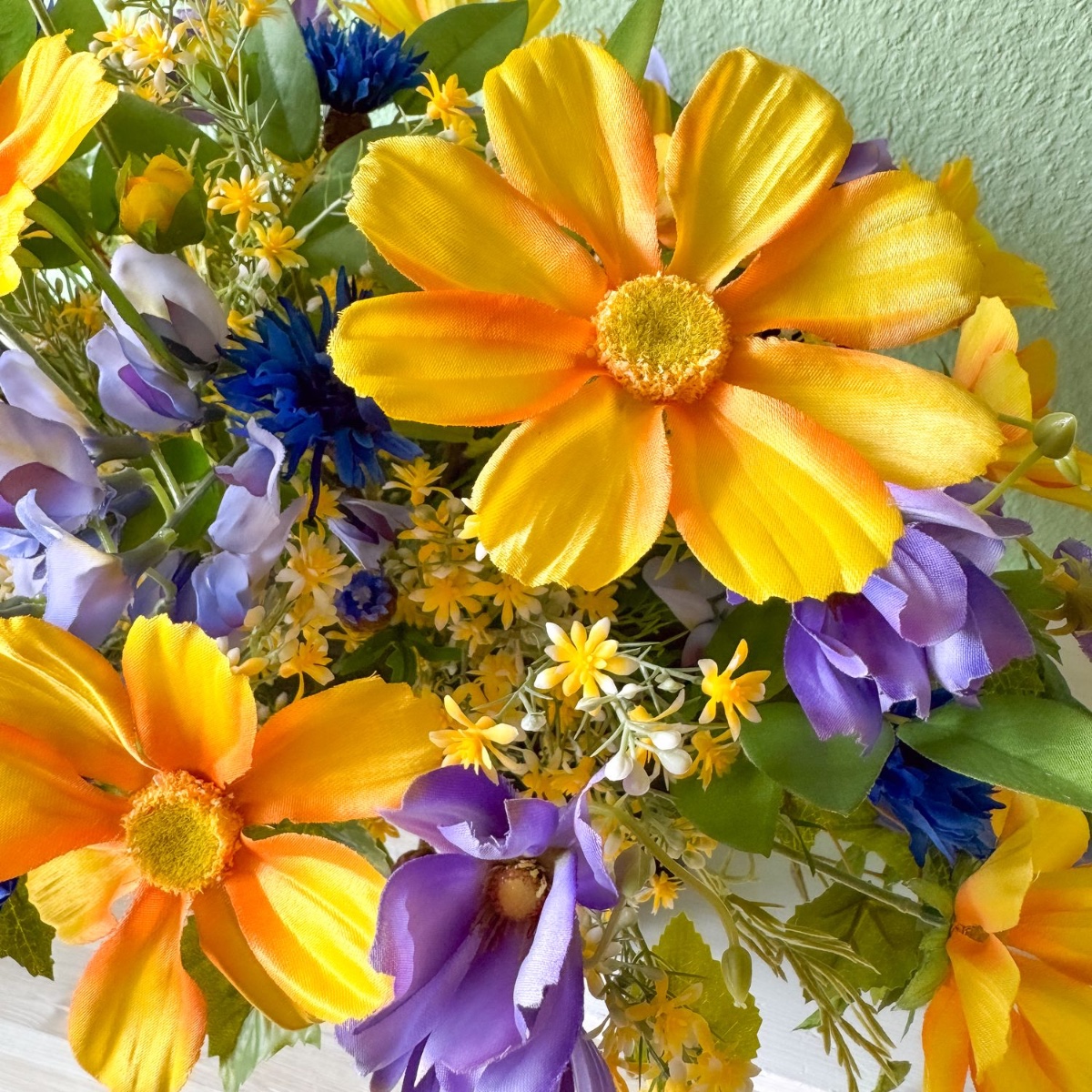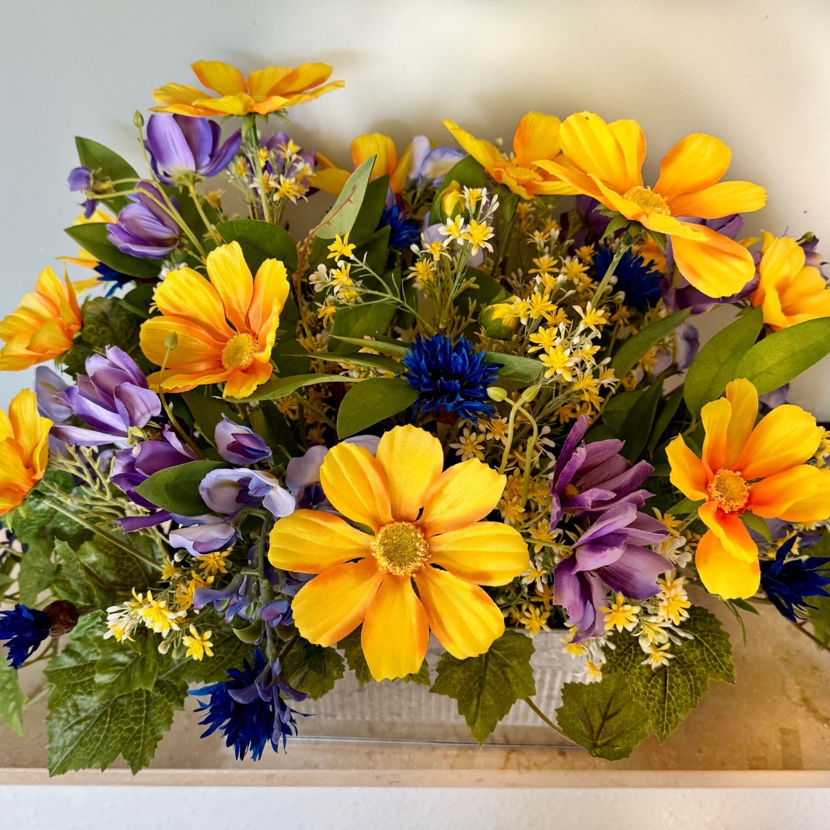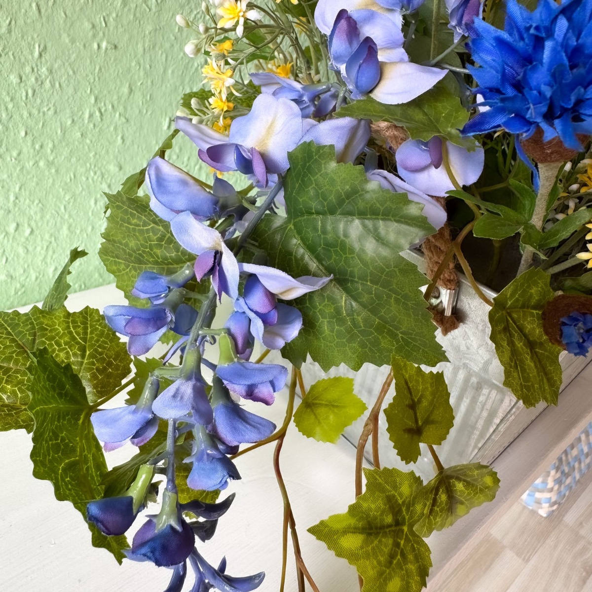 Wildblumen Liebe! Wir erhielten die zweite Anfrage von unserem Kunden Hans-Peter. Dieses Mal benötigte er ein Blumengesteck für einen Barocken goldenen Tafelaufsatz mit stilisierten Blumen. Er wünschte sich blaue Kornblumen und weitere leuchtend gelbe und lila Blumen sowie passende Weinblätter zum Tafelaufsatz. Für eine perfekte Umsetzung schickte er uns wieder den Einsatz des Gefäßes zu, sodass wir passgenau die Steckmasse darin verankern konnten. Die Kornblume wurde von uns noch ergänzt durch Schmuckkörbchen, Dill und Blauregen Zweige. Jeder Zweig wurde gekürzt und auf mehrere Blütenstiele geteilt. Diese steckten wir synchron von innen nach außen in die Steckmasse für eine gleichmäßige Verteilung. An den kurzen Seiten des Gefäßes fand die Weinrebe und der Blauregen hängend seinen Platz. Wir schickten unserem Kunden ein paar Bilder unseres ersten Exemplars. Hans Peter war begeistert und bestellte dieses gleich. Wollen auch Sie ein künstliches extravagantes Gesteck? Shop the Look!