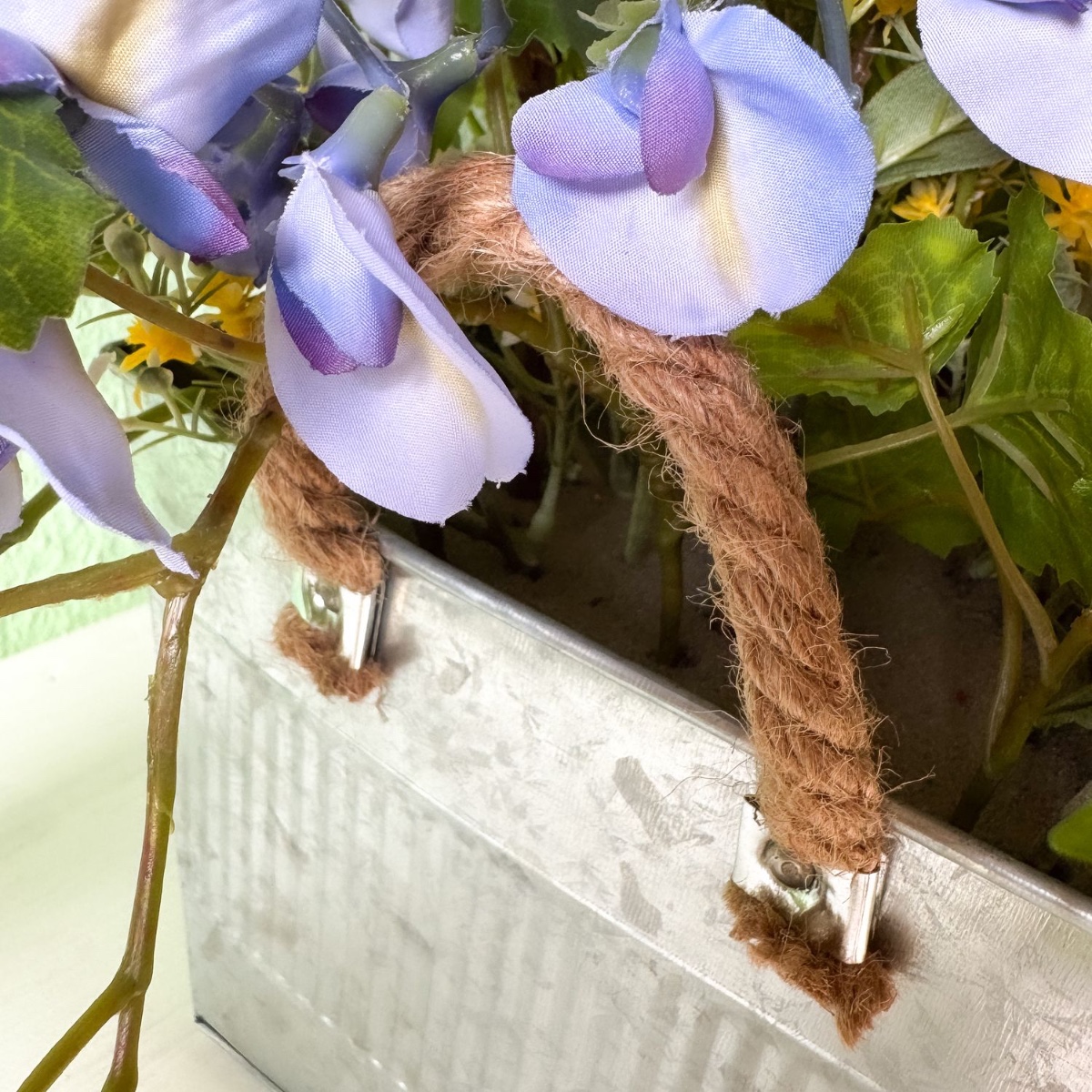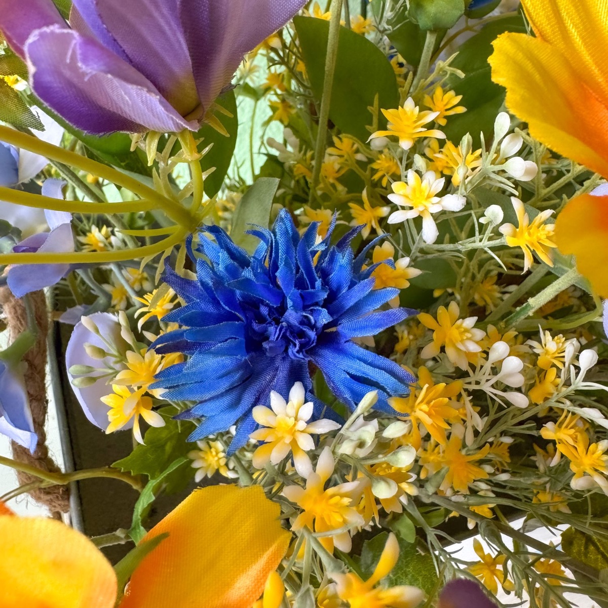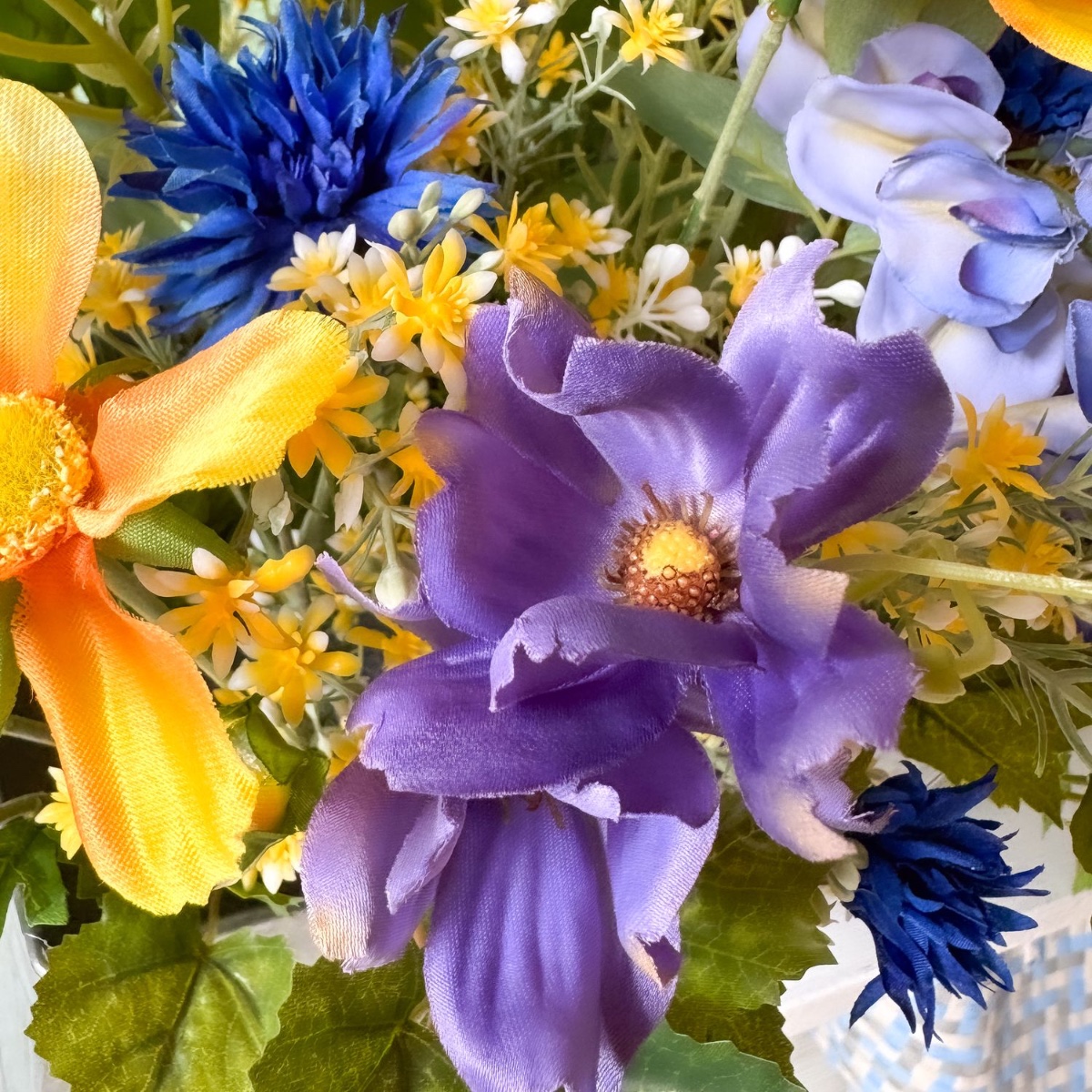 Wildblumen Liebe! Wir erhielten die zweite Anfrage von unserem Kunden Hans-Peter. Dieses Mal benötigte er ein Blumengesteck für einen Barocken goldenen Tafelaufsatz mit stilisierten Blumen. Er wünschte sich blaue Kornblumen und weitere leuchtend gelbe und lila Blumen sowie passende Weinblätter zum Tafelaufsatz. Für eine perfekte Umsetzung schickte er uns wieder den Einsatz des Gefäßes zu, sodass wir passgenau die Steckmasse darin verankern konnten. Die Kornblume wurde von uns noch ergänzt durch Schmuckkörbchen, Dill und Blauregen Zweige. Jeder Zweig wurde gekürzt und auf mehrere Blütenstiele geteilt. Diese steckten wir synchron von innen nach außen in die Steckmasse für eine gleichmäßige Verteilung. An den kurzen Seiten des Gefäßes fand die Weinrebe und der Blauregen hängend seinen Platz. Wir schickten unserem Kunden ein paar Bilder unseres ersten Exemplars. Hans Peter war begeistert und bestellte dieses gleich. Wollen auch Sie ein künstliches extravagantes Gesteck? Shop the Look!