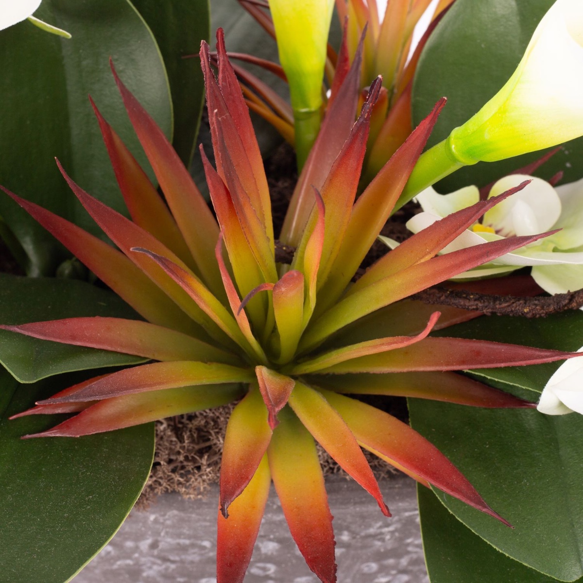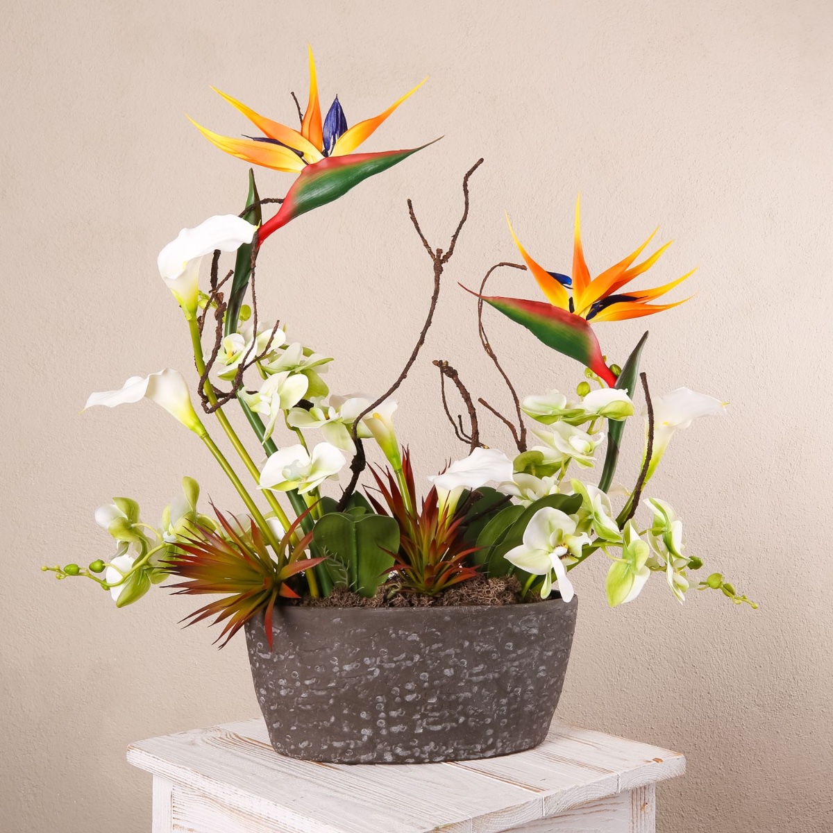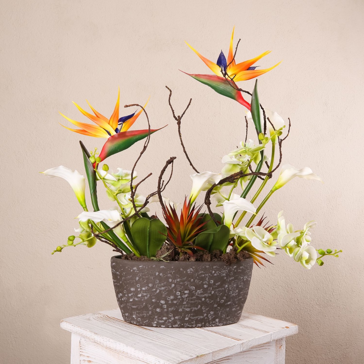 Ein faszinierendes Gesteck aus Kunstblumen vereint exotische Eleganz und moderne Natürlichkeit. Die leuchtenden, vogelähnlichen Blüten der Strelitzien setzen einen dynamischen Akzent, während die zarten Orchideen für romantische Leichtigkeit sorgen. Geschwungenen Calla-Blüten verleihen dem Arrangement eine edle Note, und die markanten Blätter der Agave bringen Struktur und ein Hauch von Wüstenflair ins Design. Dieses Arrangement eignet sich perfekt als außergewöhnlicher Blickfang für besondere Anlässe oder als kunstvolles Highlight in modernen Wohnräumen.