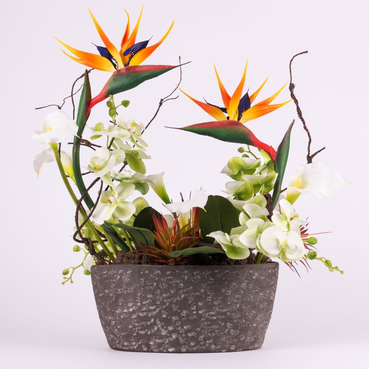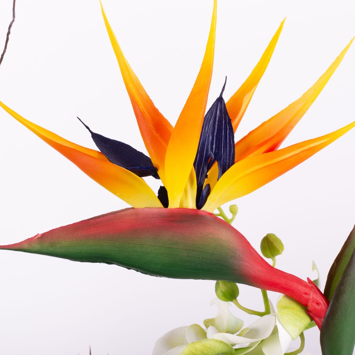 Exotisches Kunstblumengesteck LOVARA, Strelitzie, Orchidee, Calla, orange-weiß-grün, 55x30x60cm