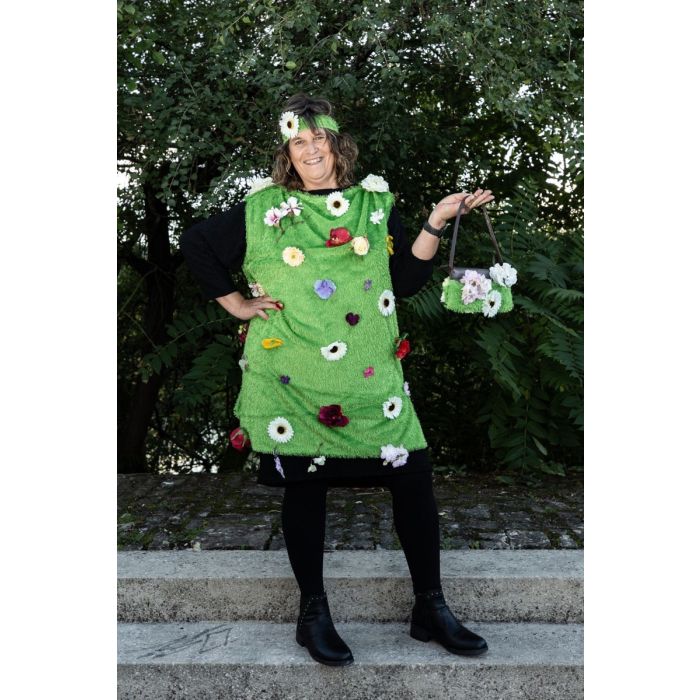 Bunt und fröhlich! So ist in Deutschland der Karneval. Es gibt viele Möglichkeiten aus unseren Produkten ein tolles Faschingskostüm zu basteln. Unsere liebe Kollegin Kerstin ist jedes Jahr besonders eifrig bei der Sache. Hier das erste Stück aus ihrer Kollektion: Die Blumenwiese. Verschiedene Blütenköpfe wie Gerbera, Rosen oder Hortensien verzieren das grüne Kleid aus Kunstrasen. Hoffentlich kommt da kein Hund um die Ecke. Shop the Look!