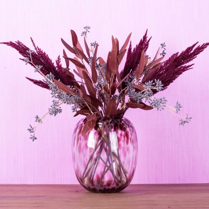 Ton in Ton! Pampasgras und Eukalyptus in Bordeauxfarben. Das ist eigentlich untypisch für diese Produktgruppe. Aber es gibt sie! Ein Grund mehr für uns daraus einen Look zu kreieren. Die Vase im Leopardenstil aus unserer Serie RUSSELL passt mit ihren dunkelroten Flecken ausgezeichnet zu diesem Strauß. Braun-verwaschene Eukalyptus Fruchtzweige lockern das gesamte Bild und lassen den Strauß lebendig wirken. Ein Traum für jedes Wohnzimmer. Shop the Look!