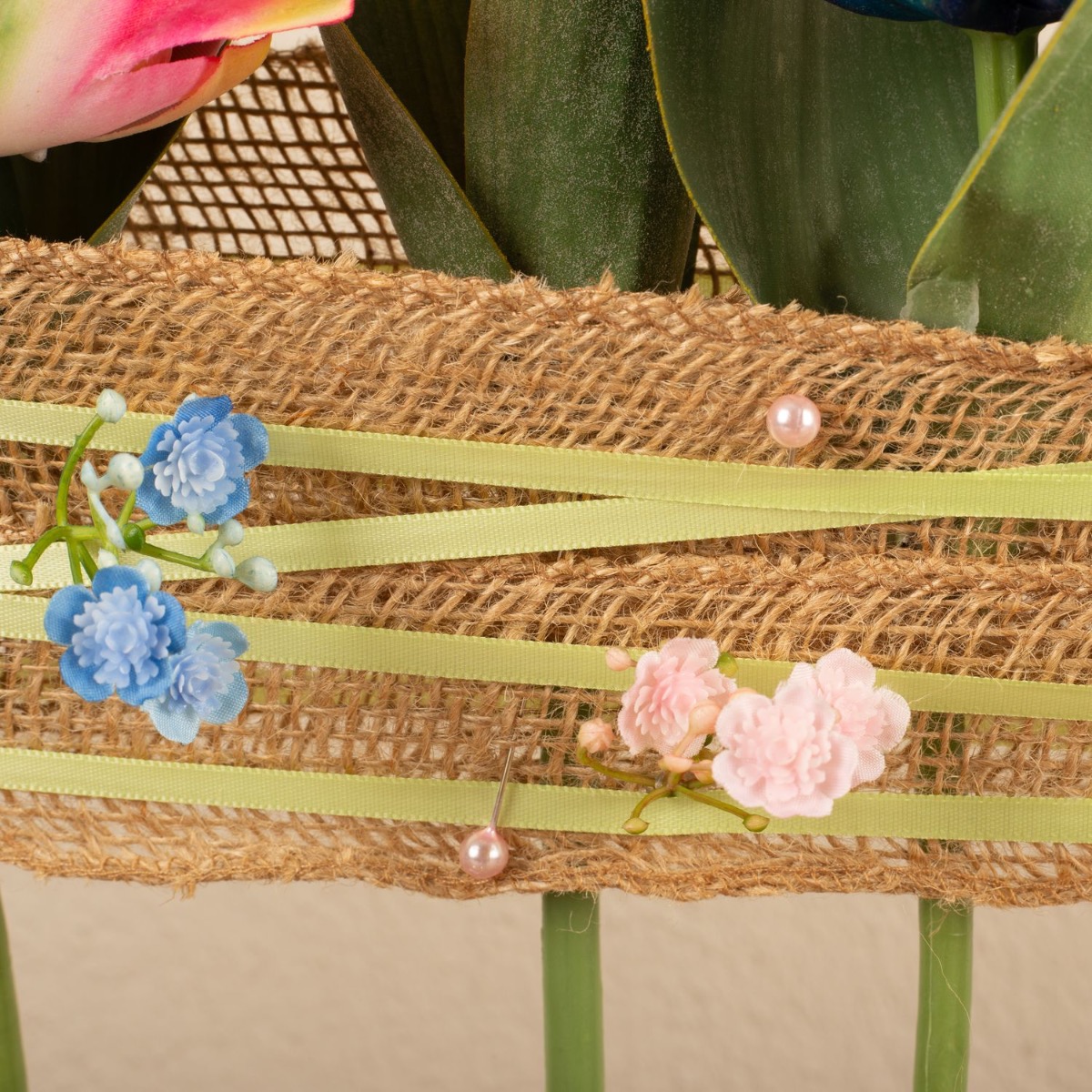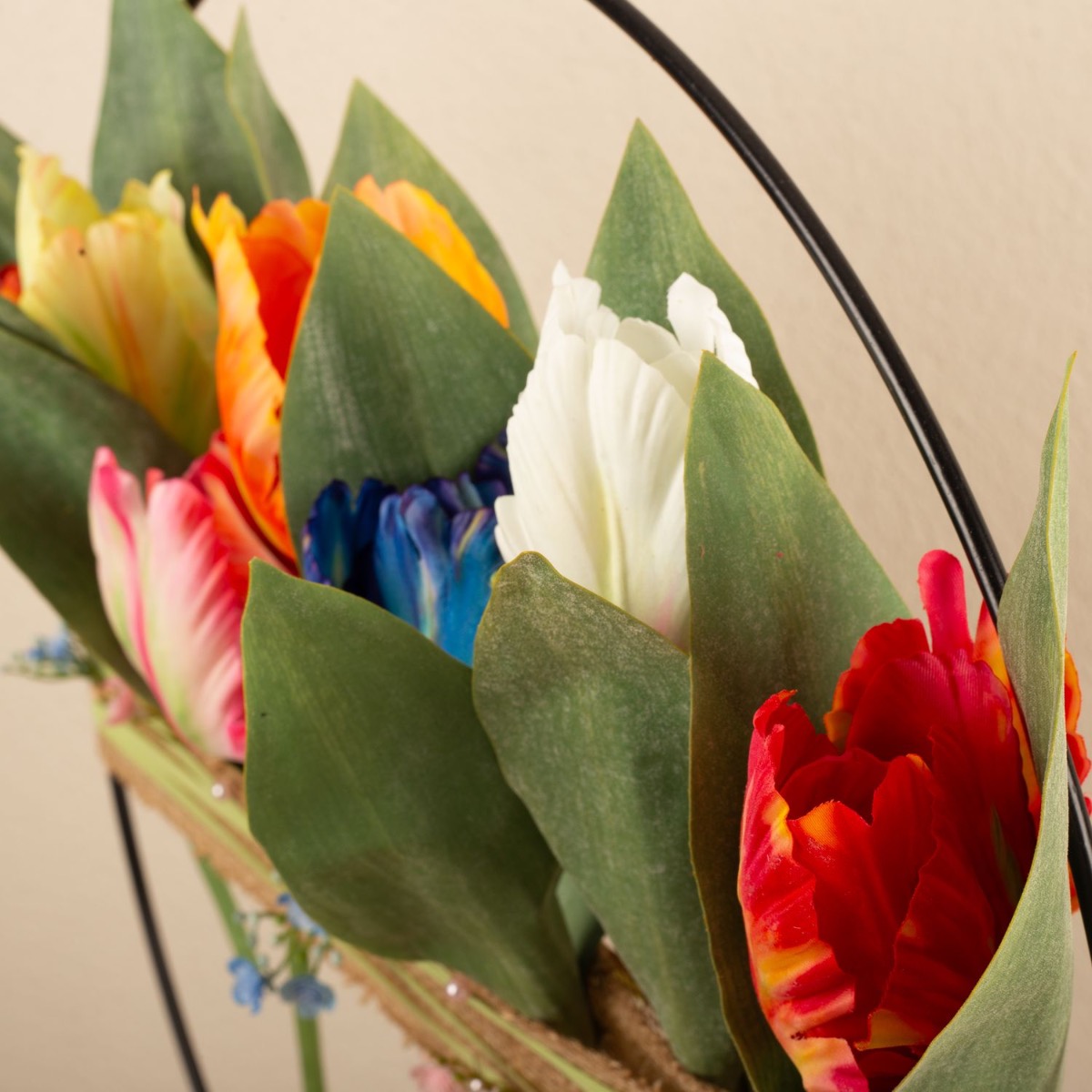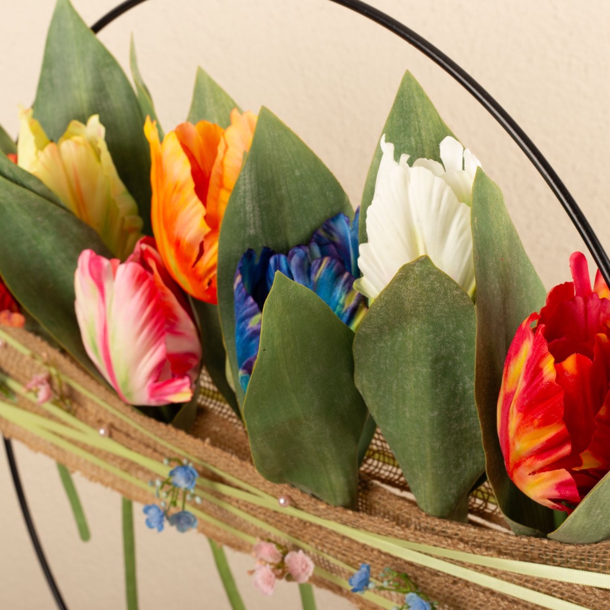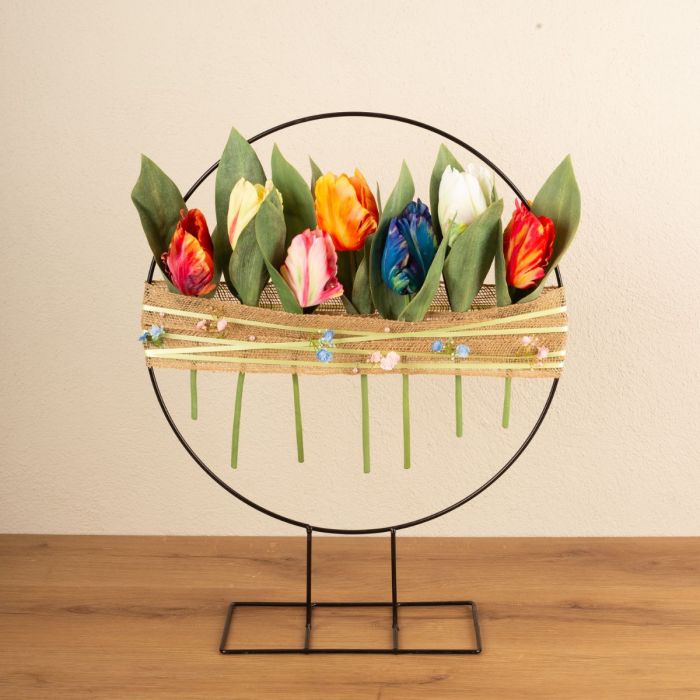 Bunt, wie der Frühling! Der Winter ist nun endlich vorüber und die Frühblüher sprießen auf den Wiesen. Unsere Tulpen aus der Serie UAKARI gibt es in allen Farben, sodass wir für diesen Look eine riesige Auswahl hatten. Der Metallring ist immer eine gute Basis für moderne Dekorationen und passt auch super für diese Frühlingsdeko. Das breite Juteband dient als Halterung für die Tulpen und wurde mit einem grünen Satinband verziert. Kleine Schleierkrautblüten runden diese schöne Frühlingsdeko ab. Shop the Look!