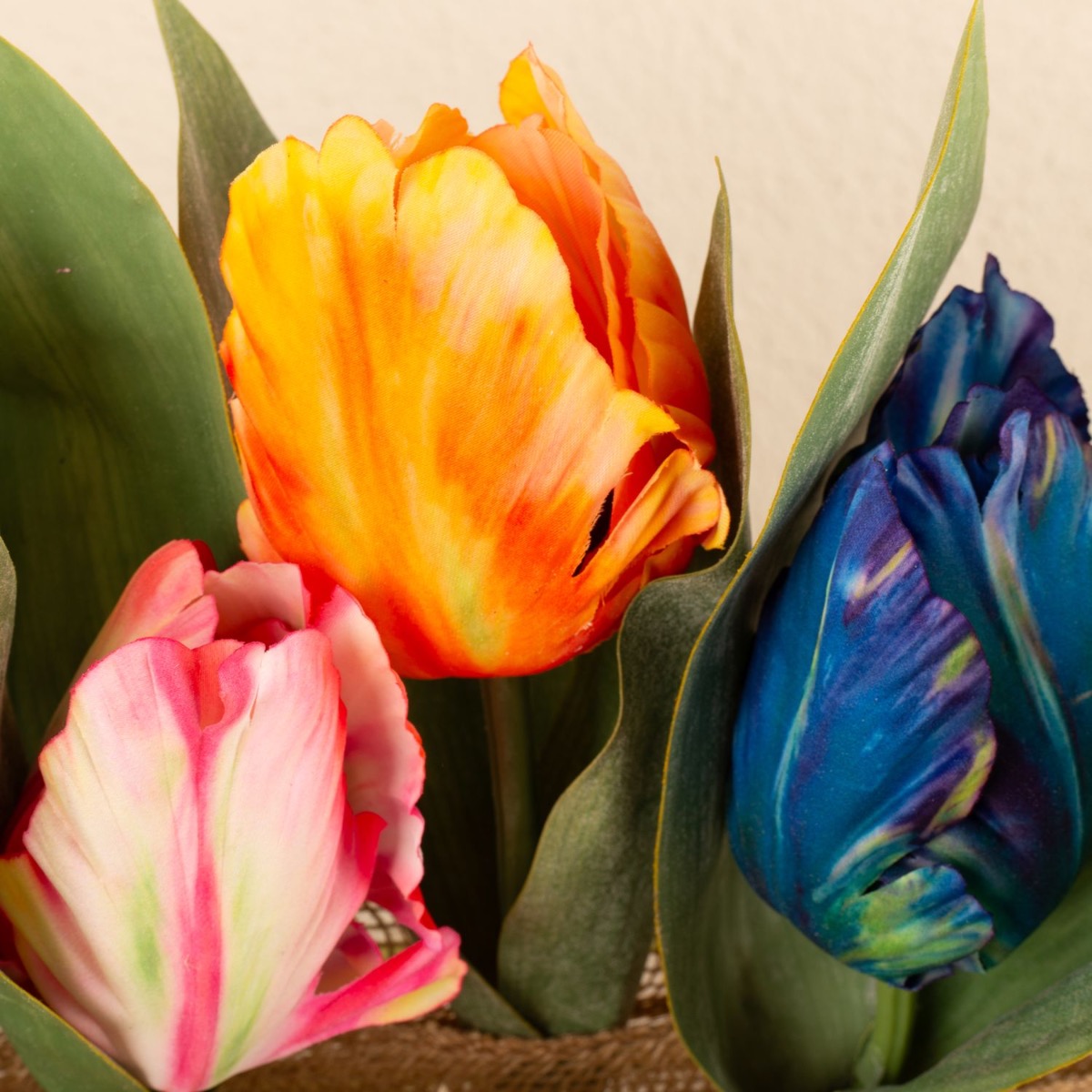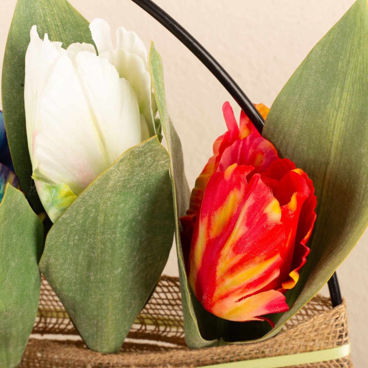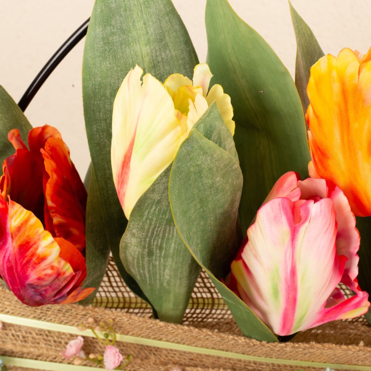 Bunt, wie der Frühling! Der Winter ist nun endlich vorüber und die Frühblüher sprießen auf den Wiesen. Unsere Tulpen aus der Serie UAKARI gibt es in allen Farben, sodass wir für diesen Look eine riesige Auswahl hatten. Der Metallring ist immer eine gute Basis für moderne Dekorationen und passt auch super für diese Frühlingsdeko. Das breite Juteband dient als Halterung für die Tulpen und wurde mit einem grünen Satinband verziert. Kleine Schleierkrautblüten runden diese schöne Frühlingsdeko ab. Shop the Look!