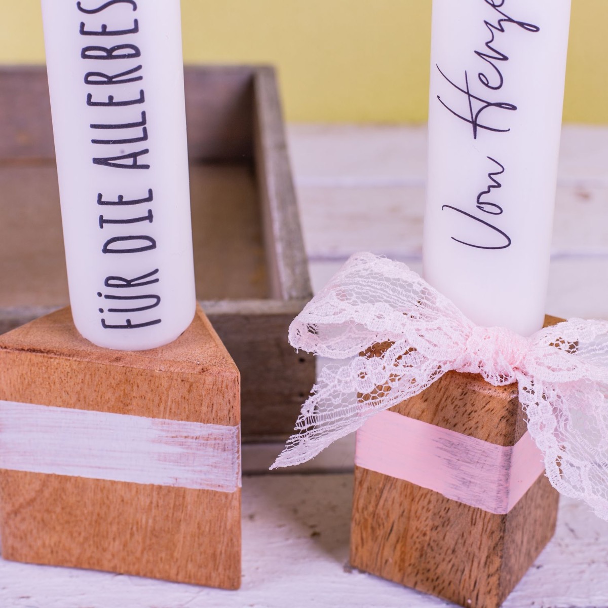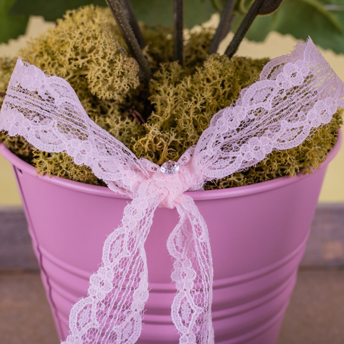 Gestaltungstipp: Das Hortensienstöckchen zurechtbiegen und in den Übertopf stellen. Mit grünem Naturmoos bedecken. Aus einem Spitzenband eine Schleife binden und diese mit einem Diamantstecker befestigen. Eine weitere Schleife kann um die Kerze gebunden werden.