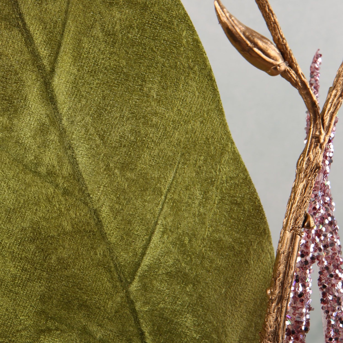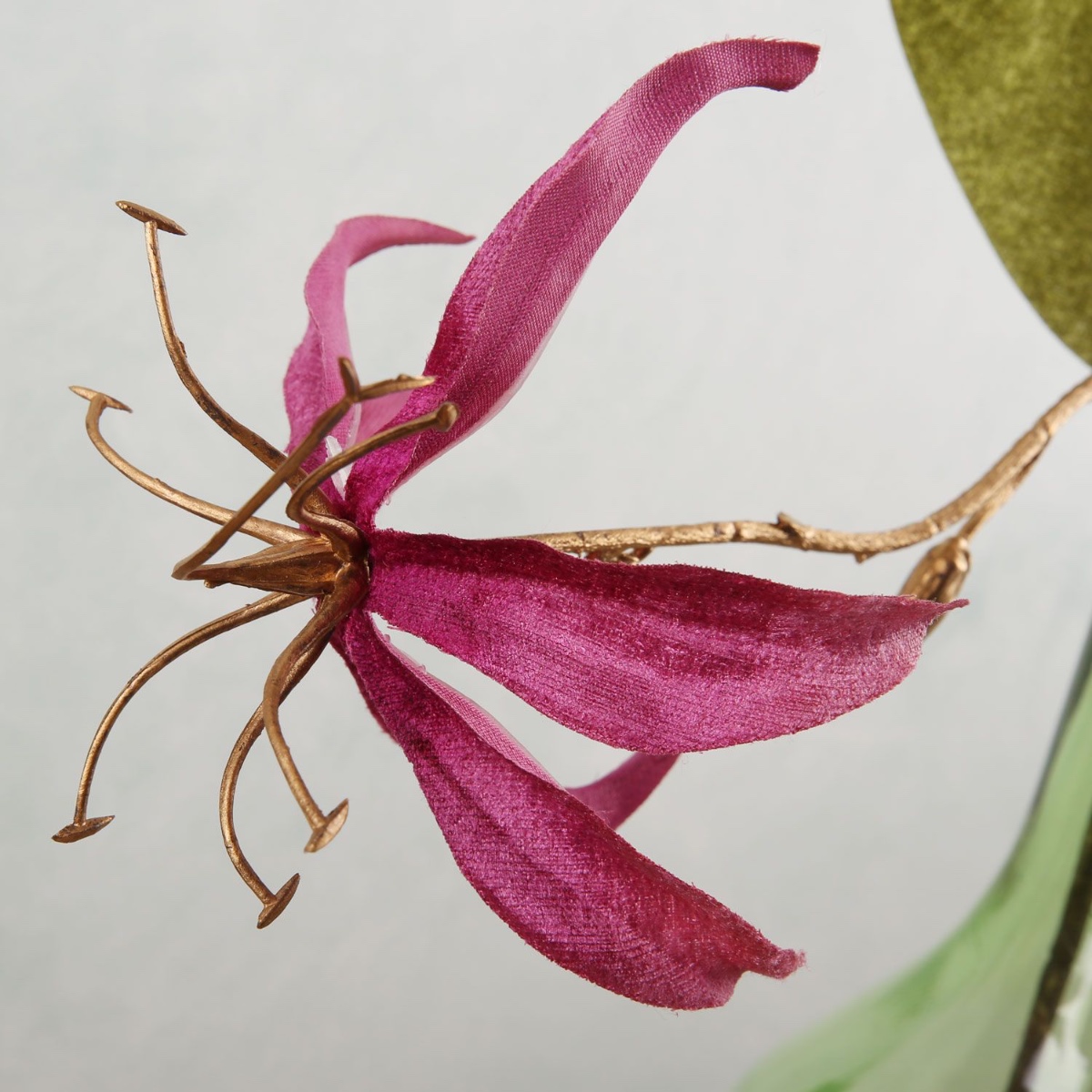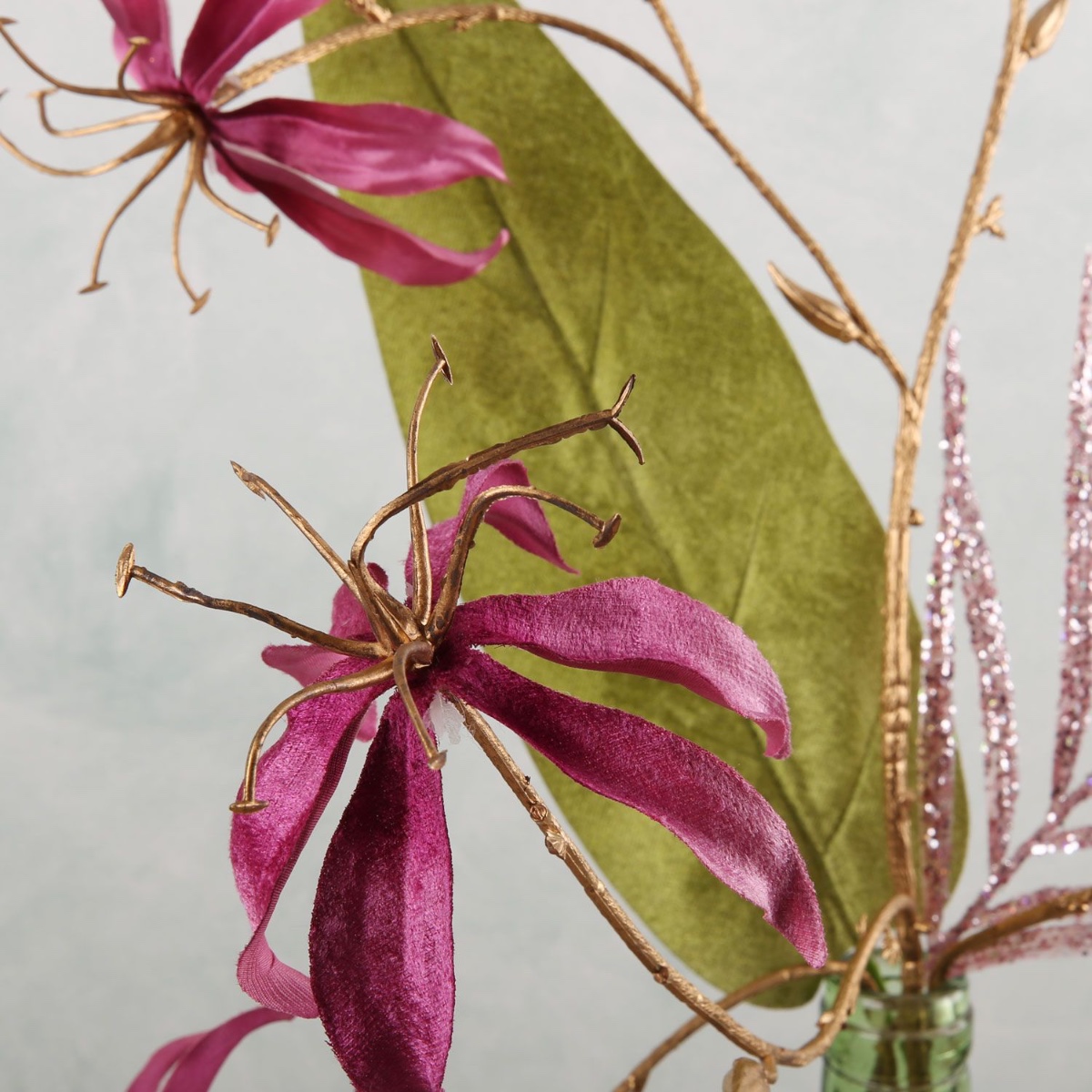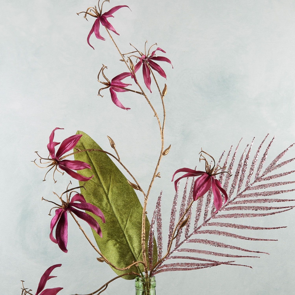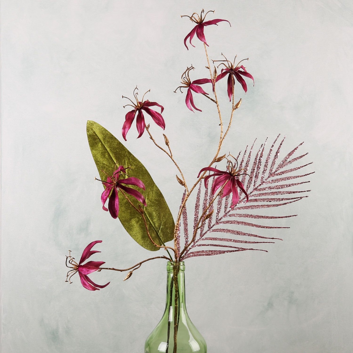 Gold, Fuchsia und Lindgrün! Stilvoll und elegant erscheint dieser Look, der nur aus 4 Artikeln besteht. Die filigrane Gloriosa ist mit ihrem goldenen Stiel ein besonderer Blickfang. Auch das leuchtende Fuchsia der Blüten wirkt mit seiner samtigen Oberfläche außergewöhnlich und verleiht der Deko das „gewisse Etwas“. Da passt das samtige Bananenblatt richtig gut dazu. Ein bisschen Glamour kommt von unserem glitzernden Palmwedel. Shop the Look!