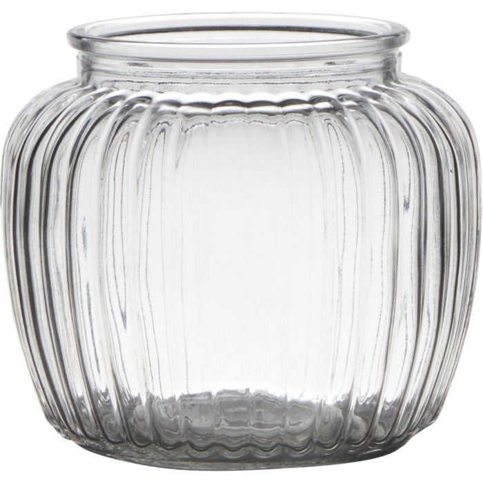 Originelles Glas mit Rillen von INNA GLAS NOLAN und den Maßen 13 cm; Ø 15 cm. Mit dem transparenten Windlicht setzten Sie spannende Lichtakzente, oder Sie verwenden es als Blumenvase.