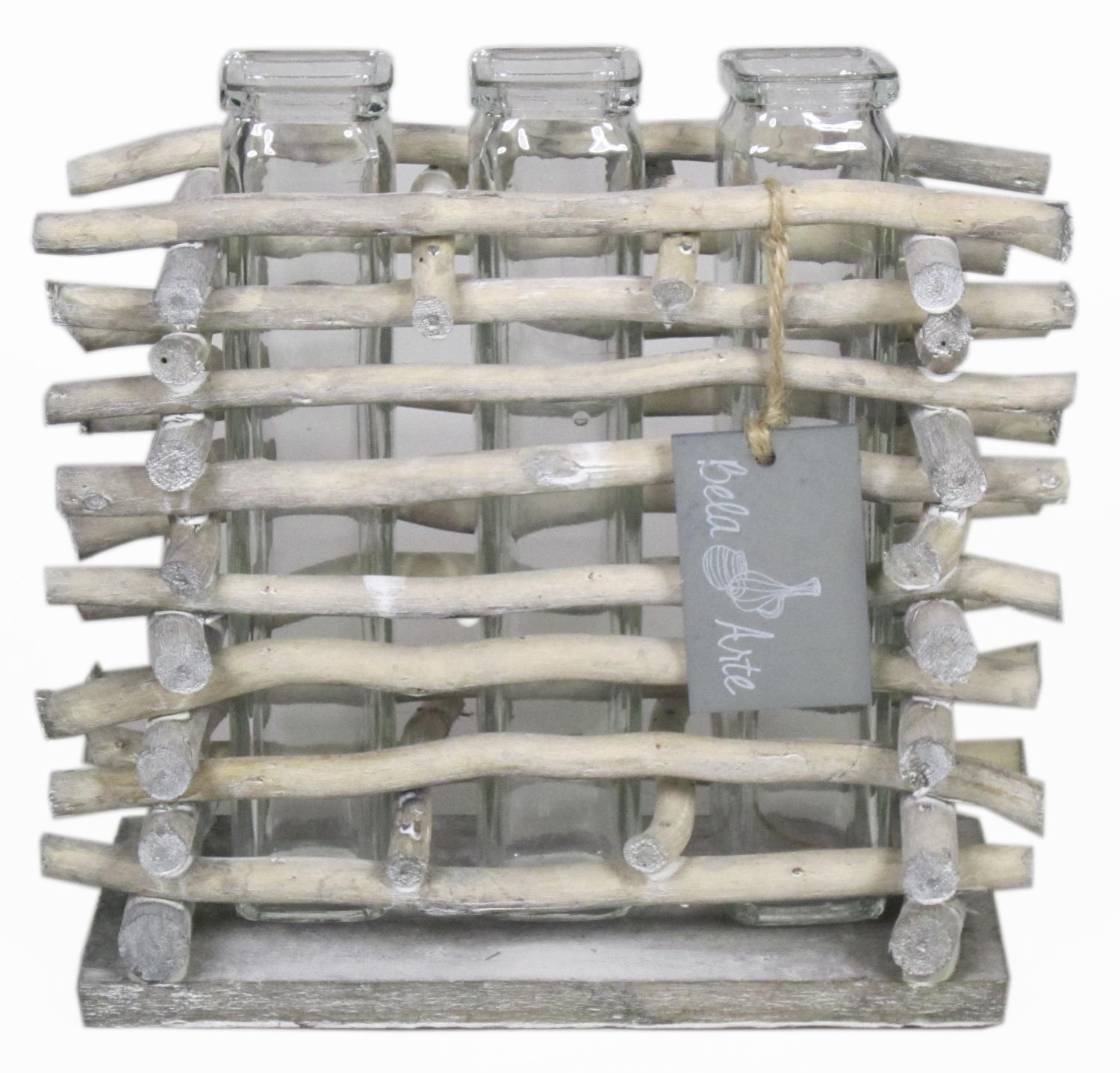 Glas Vase für Stielblumen SIHAM, Holzständer, 3 Gläser, klar, 18x8,5x17cm