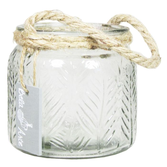 Glas Windlicht FEENA, Blattrelief, Henkel, klar, 10,5cm, Ø11cm