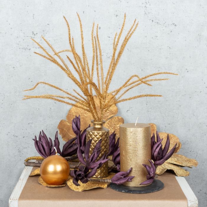 Violett und Gold! Eine stimmungsvolle Farbkombination, die besonders gut in die Winterzeit passt. Wenn es draußen kalt ist, dann möchte man Wärme in sein Zuhause bringen. Die warmen Goldtöne sind hier besonders gut geeignet, denn sie erzeugen auch eine festliche Stimmung für die bevorstehende Weihnachtszeit. Die Lilafarbenen Kunstschaumblüten ragen zwischen der Tischdeko hervor und umspielen die goldenen Elemente auf dem Tisch. Verzaubern auch Sie Ihre Gäste mit dieser traumhaften Deko. Shop the Look!