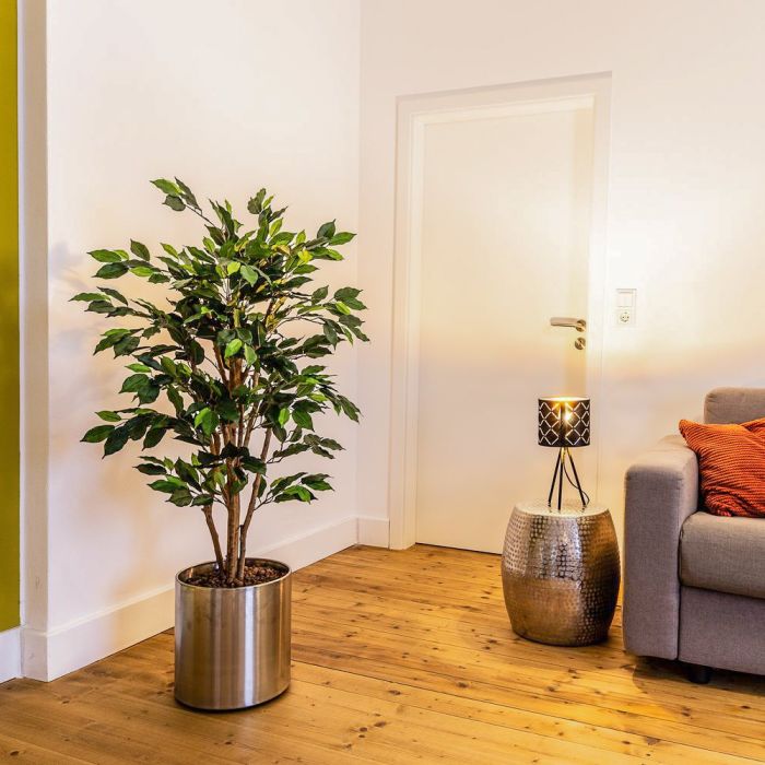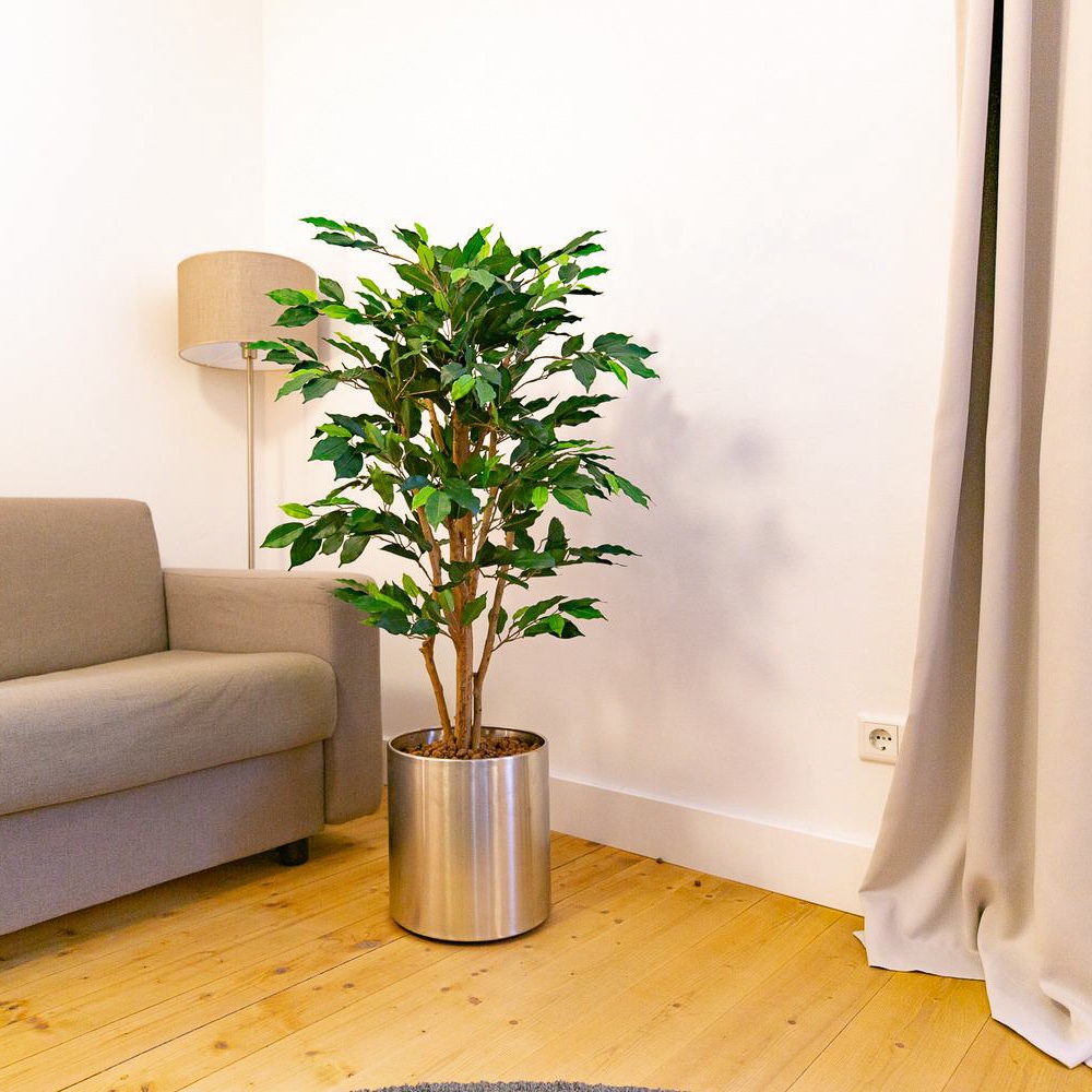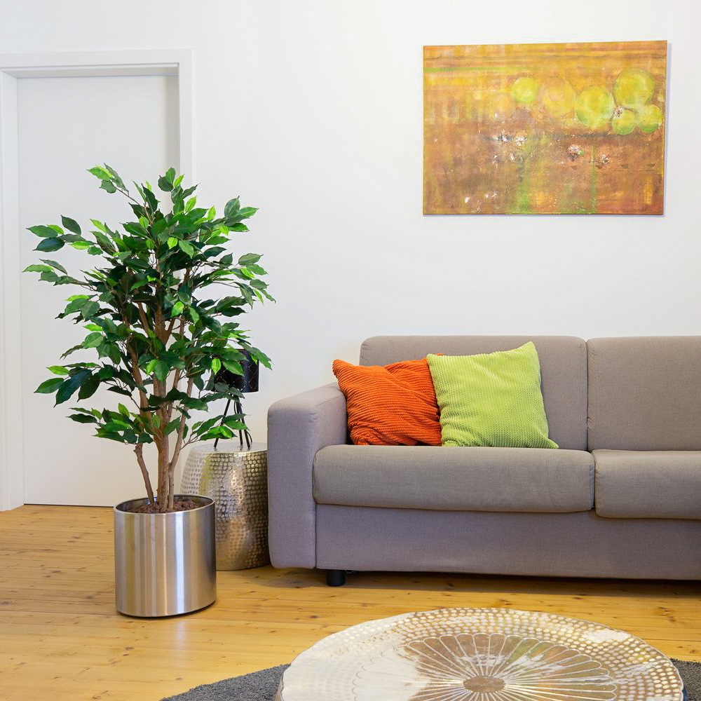 Ein stiller Mitbewohner mit beruhigender Wirkung! Unsere Zimmerpflanzen machen jeden Raum wohnlicher, und – durch ihre Schattenwirkung – auch gemütlicher. Unser Ficus Benjamini eignet sich für eine dezente Zimmerdeko besonders gut, denn er nimmt nicht zu viel Platz ein und erhellt mit seinem saftigen Grün jede dunkle Ecke. Der Übertopf ist ein echter Klassiker, der durch sein elegantes Design überall dazu passt. Das tolle ist, er hat Rollen, sodass man seine Zimmerpflanze jederzeit und ohne große Mühe verschieben kann. Shop the Look!