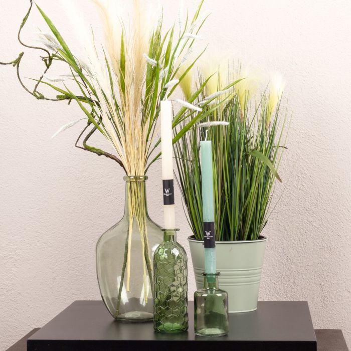 Grün, grün und grün! Die Farbe, die immer im Trend ist. Was für die Augen entspannend und beruhigend wirkt, ist auch im Wohnbereich eine Oase der Erholung. Unser Look zeigt Gräser in verschiedenen Grün- und Brauntönen, die harmonisch aufeinander abgestimmt wurden. Die grünen Flaschen eignen sich nicht nur als Vase, sondern sind auch perfekt als Kerzenhalter geeignet. Bei diesem Look spürt man fast die zarte Sommerbrise. Shop the Look!
