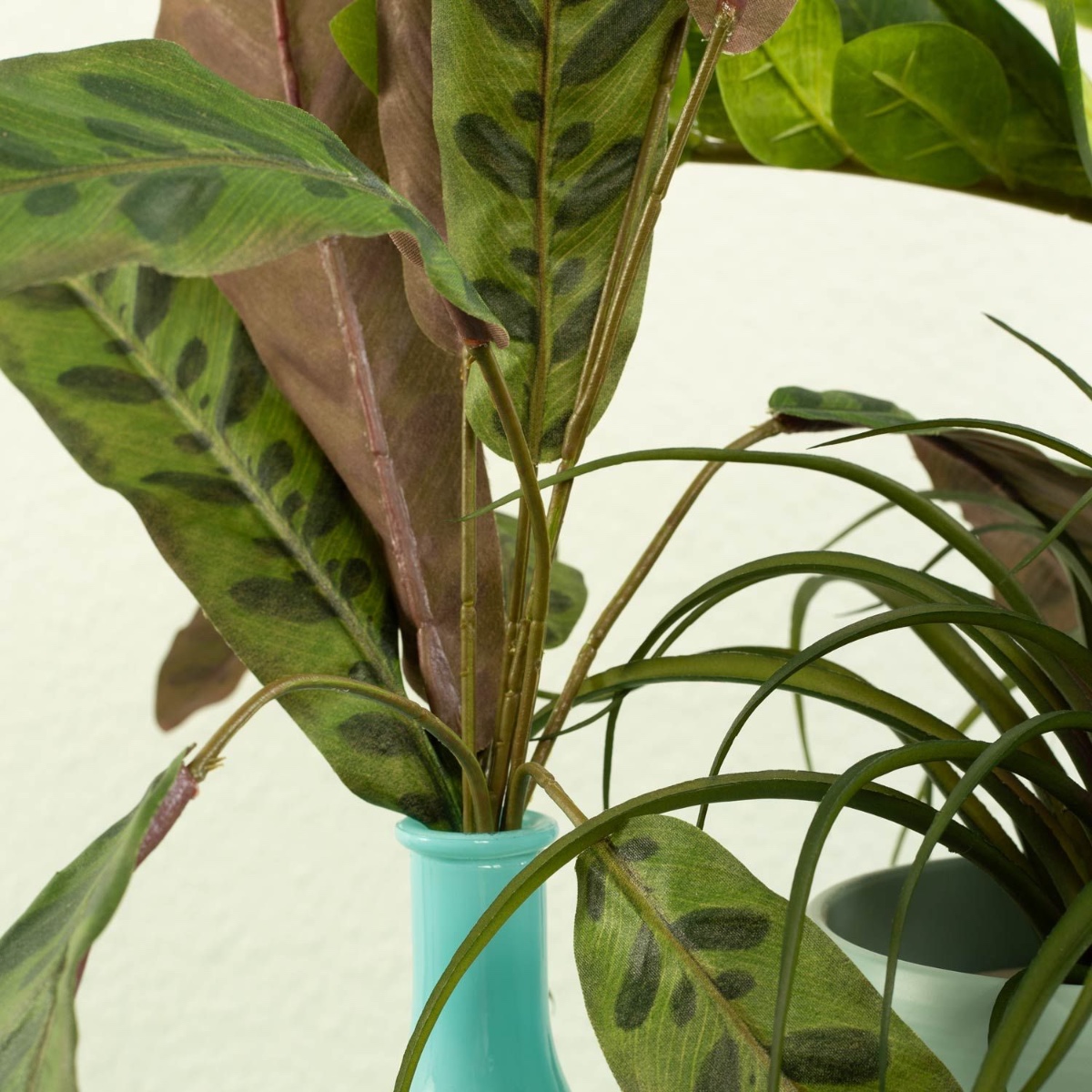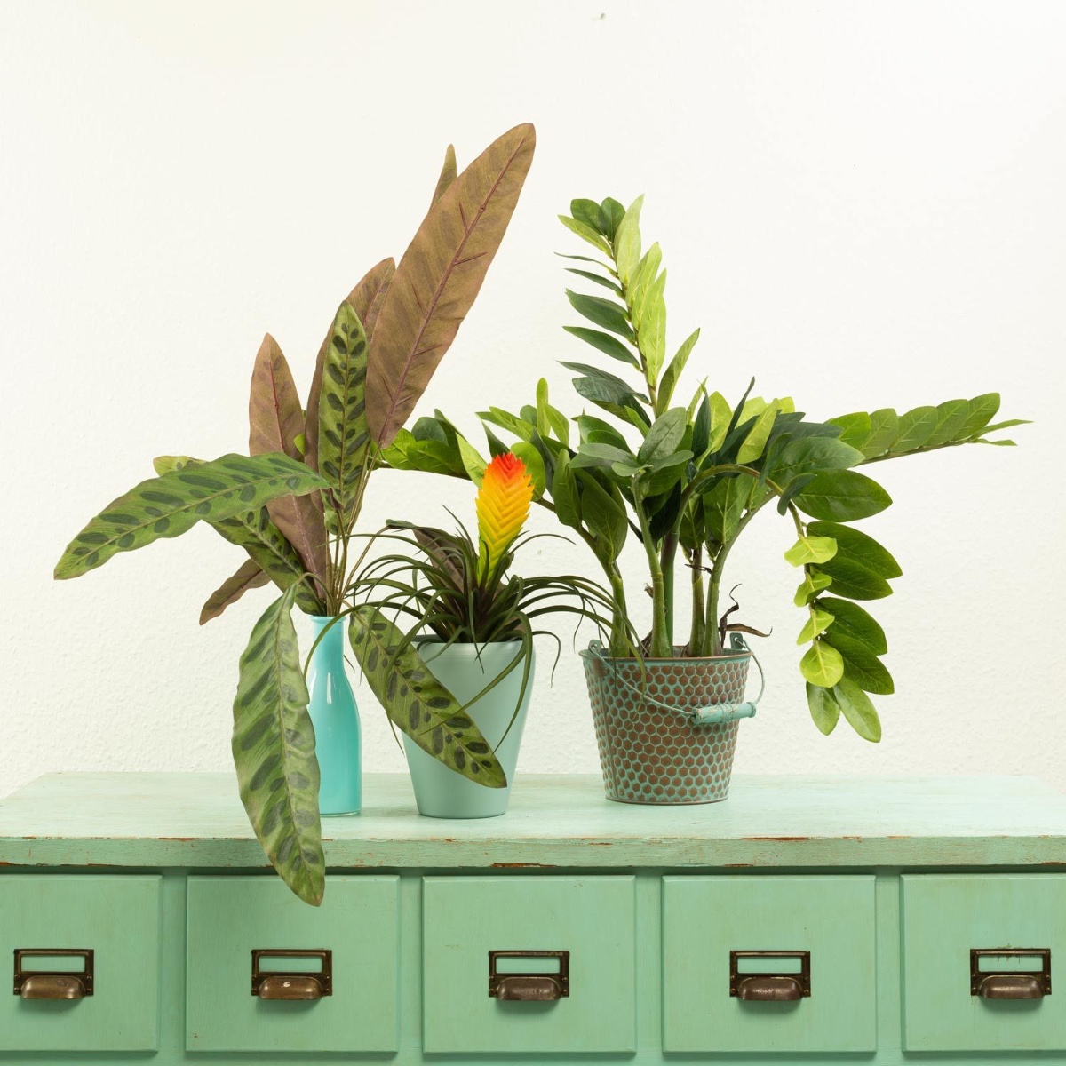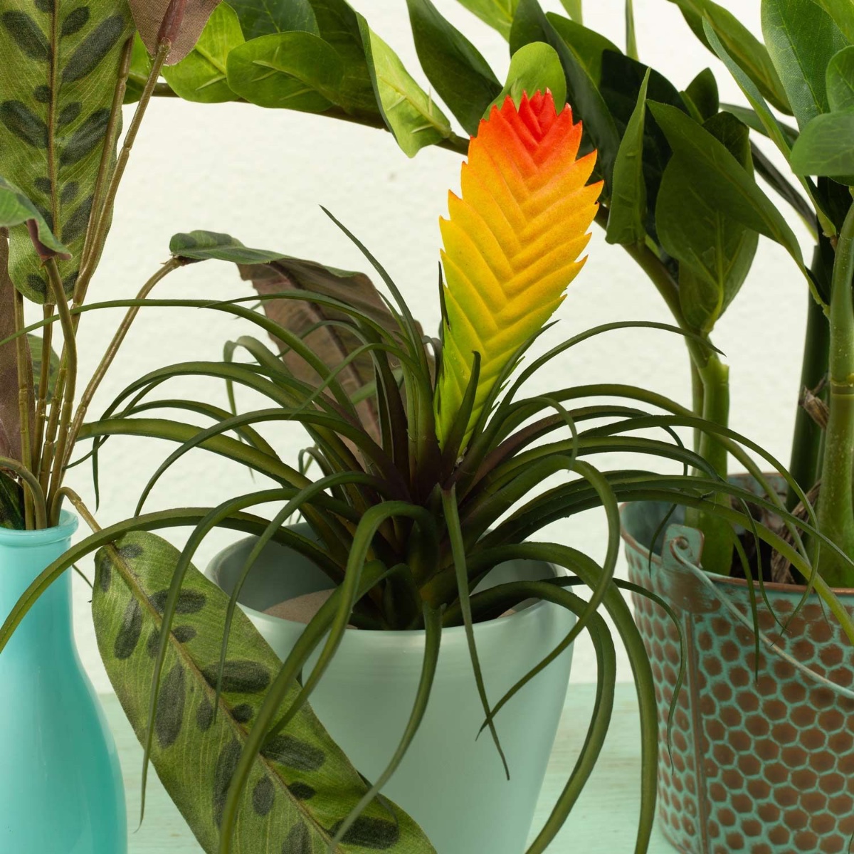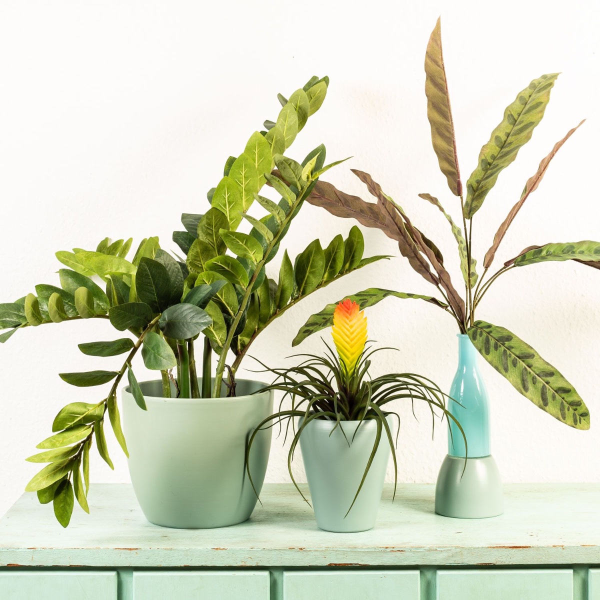 Gestaltungstipp: Die Glücksfeder einfach in den Übertopf stellen. Den Calathea-Steckstab einfach in die Flasche stecken und den Vriesea-Steckstab in den hohen Orchideentopf stellen und mit Korkgranulat befüllen. Alle Pflanzen zurechtbiegen.