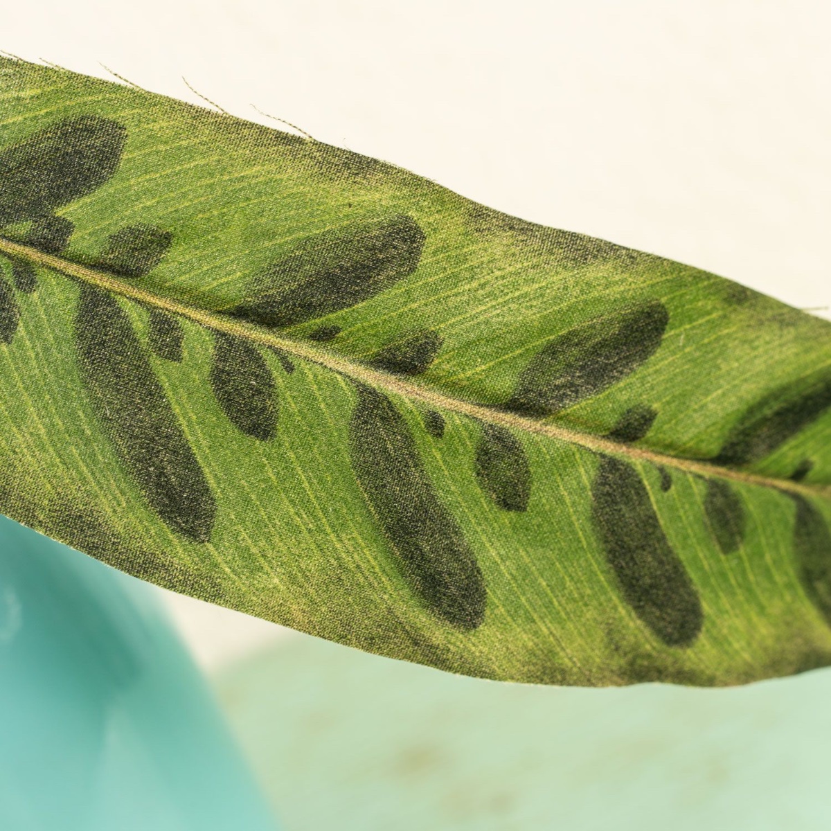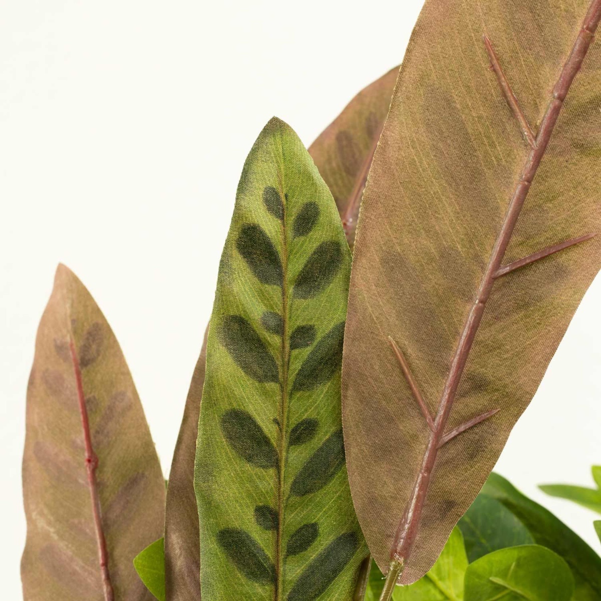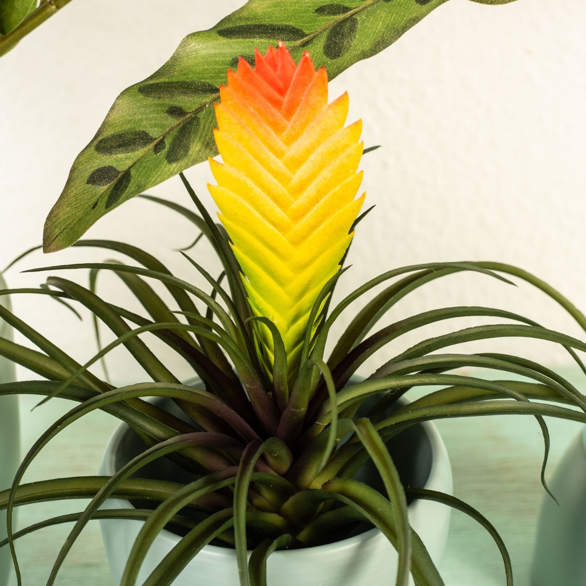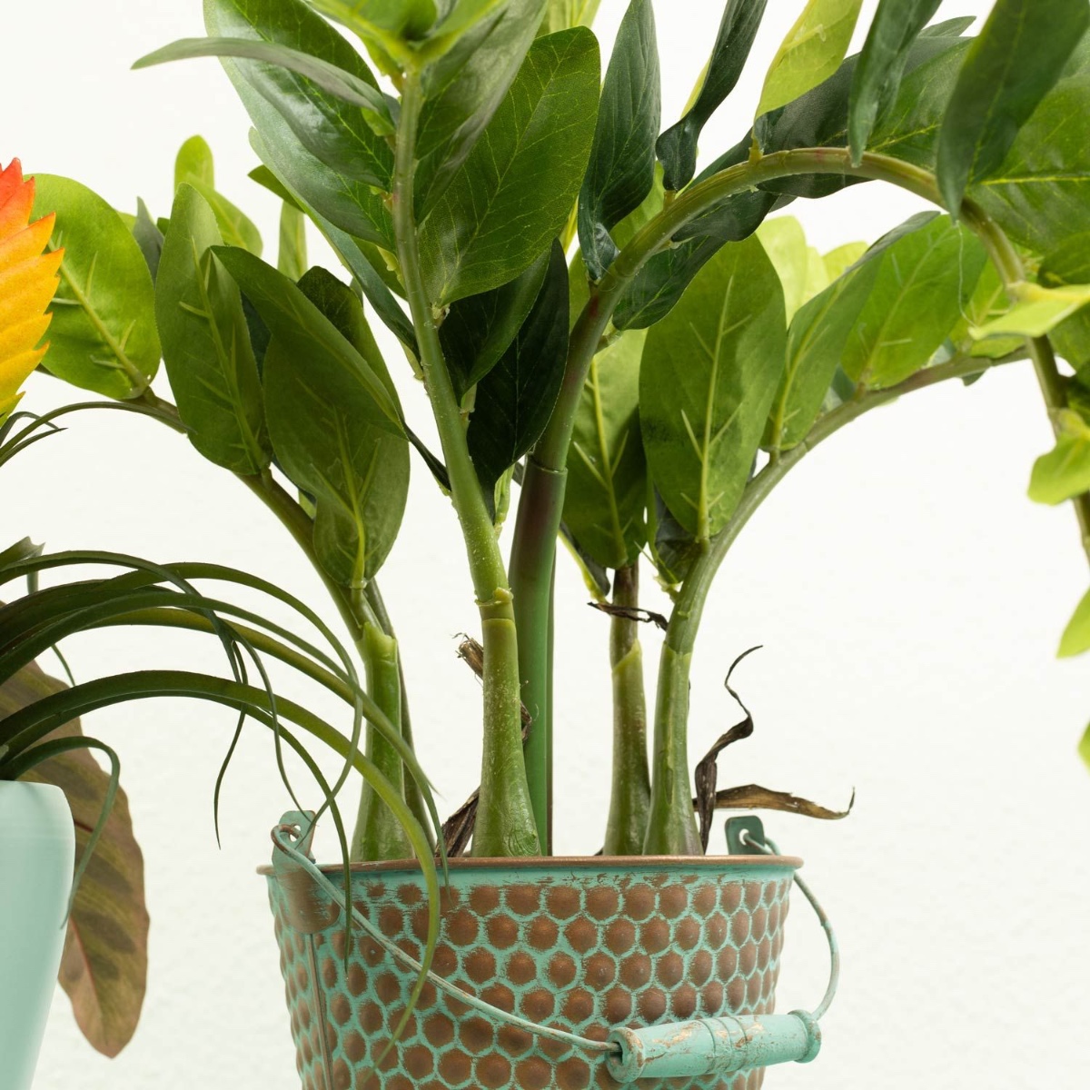 Gestaltungstipp: Die Glücksfeder einfach in den Übertopf stellen. Den Calathea-Steckstab einfach in die Flasche stecken und den Vriesea-Steckstab in den hohen Orchideentopf stellen und mit Korkgranulat befüllen. Alle Pflanzen zurechtbiegen.