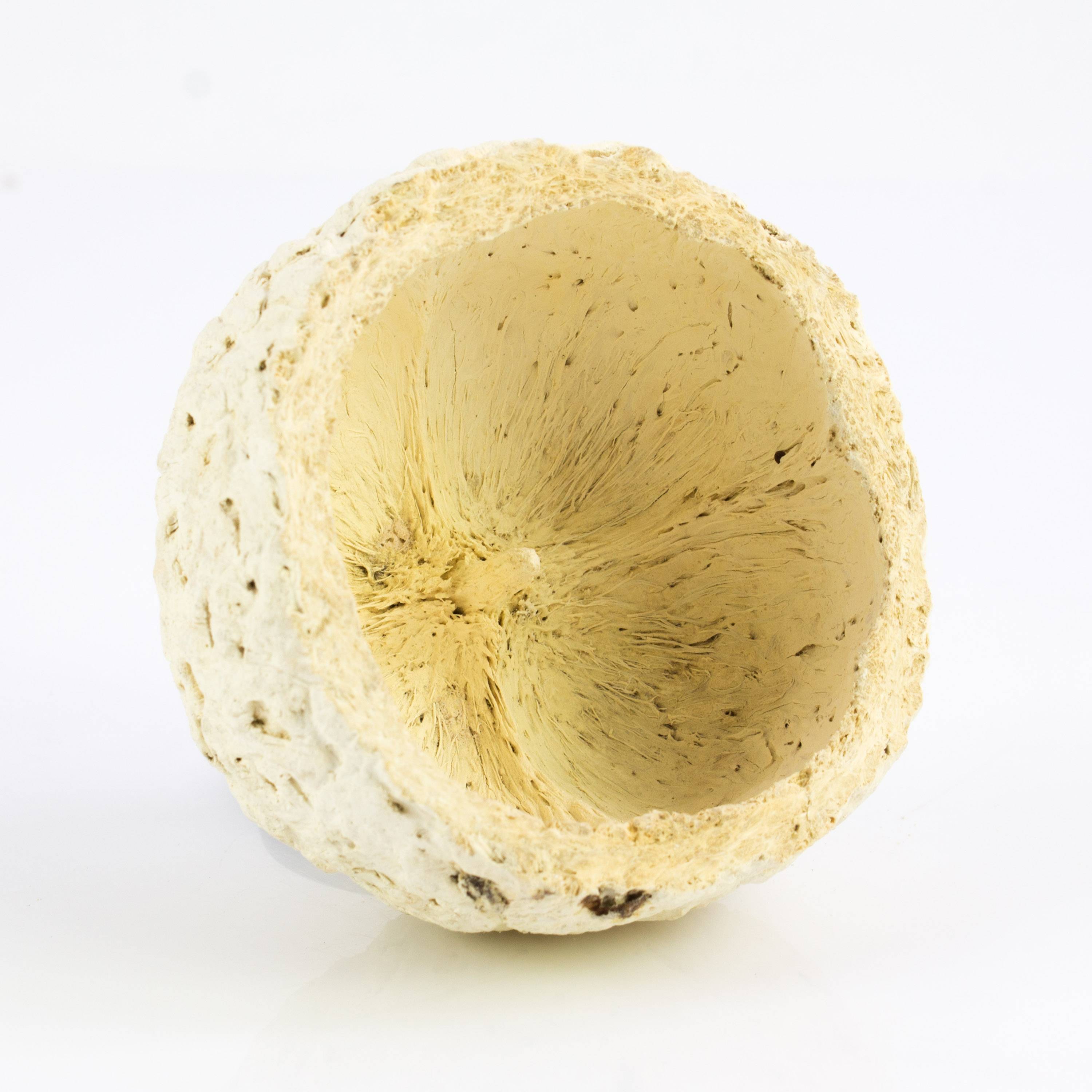 Getrocknete Kokosnuß-Schalenhälfte mit einer Größe von ca. 7 x 10 cm. Die faserige Naturhülse ist halbiert selbststehend und wirkt cremefarbig gekalkt als puristische Tischdekoration sehr schön.