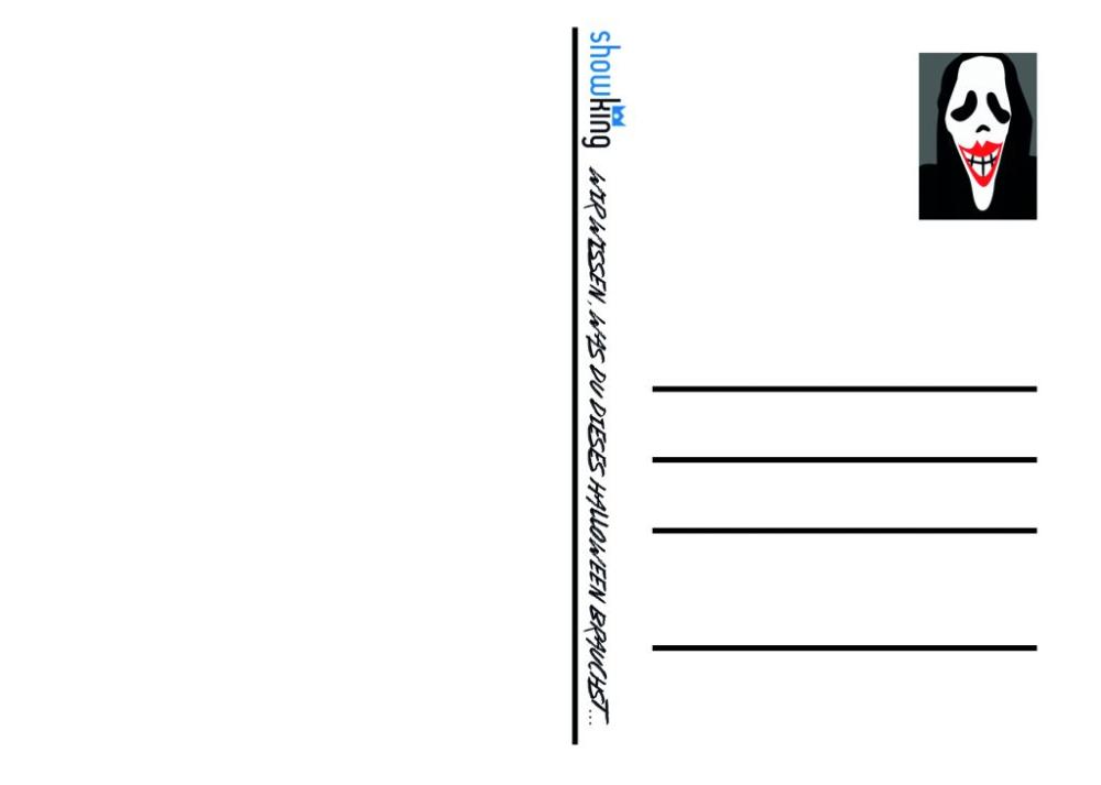 Hast du in deiner Bestellung keine umheimliche Postkarte gefunden, willst online Halloween Grüße verschicken oder vielleicht die Ansichtskarte selbst zu Hause ausdrucken? Nachfolgend findest Du unsere gruselige Halloween Postkarte als kostenlosen Download. Du kannst sogar zwischen der Vorder- oder Rückseite wählen :)