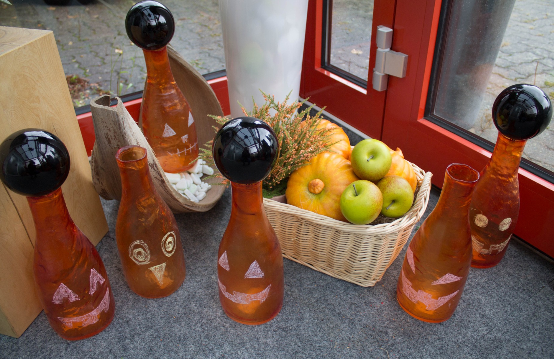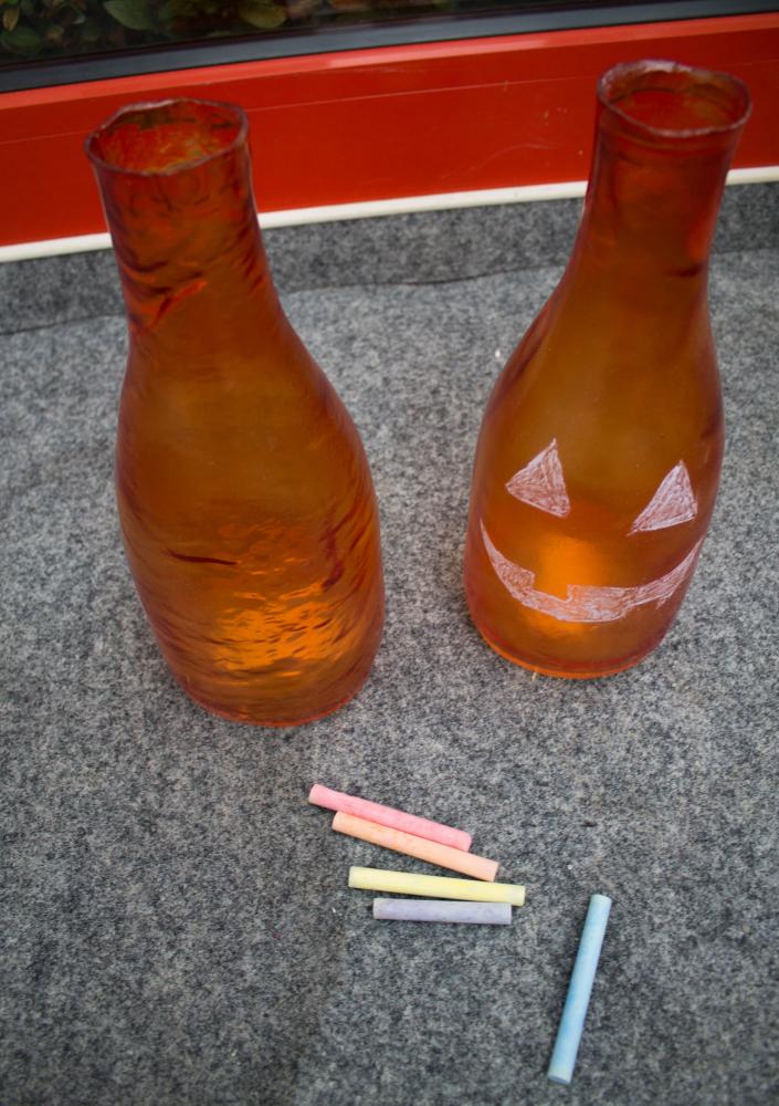 Dabei haben wir uns natürlich auch ein paar kleine Bastel- bzw. Dekoideen überlegt. Beispielsweise haben wir orange Flaschen, die wir gerne auch für diese Deko weiterverwenden würden. Als leere Flaschen waren sie uns allerdings zu langweilig, deshalb haben wir sie kurzerhand wie Kürbisgesichter bemalt. Am schnellsten und einfachsten geht das mit ganz normaler Kreide. Das hat den Vorteil, dass wir die Plastikvasen ganz leicht wieder abwischen und für andere Dekorationen benutzen können.