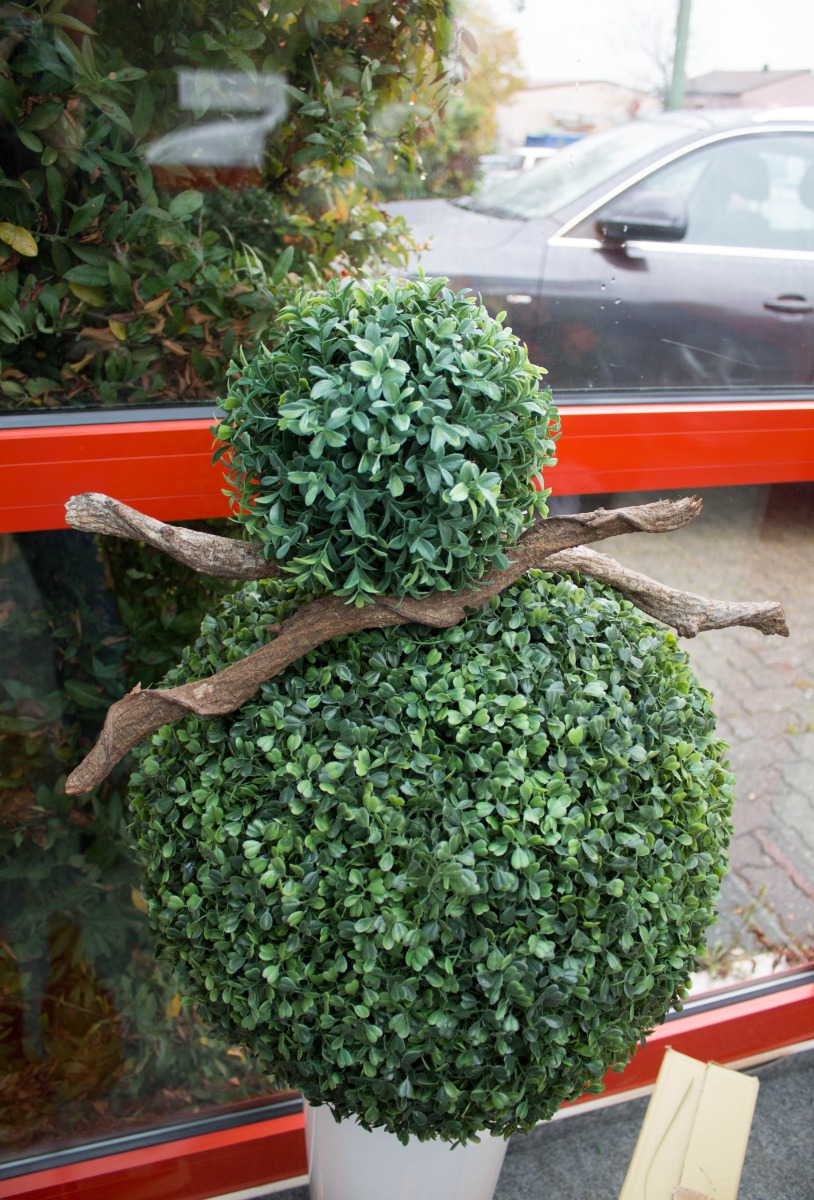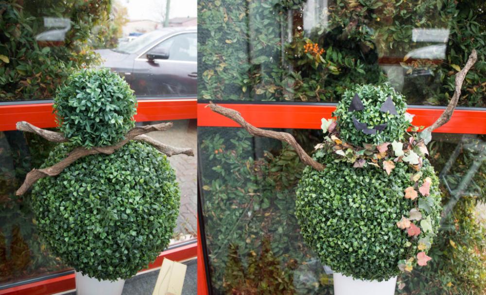 Zwei ausrangierte Buchskugeln haben wir mit Hilfe von zwei Dekoäasten, einer Girlande und ein bisschen Papier in ein Monster verwandelt. Am einfachsten kann man die Zweige bei einer künstlichen Buchskugel mit Styroporkern befestigen. Dazu muss nur der Ast in das Styropor gedrückt werden und fertig sind die Arme des Monsters. Noch ein paar Augen und ein Mund aufgeklebt und schon ist aus zwei langweiligen Kunstbuchskugeln ein Männchen entstanden.