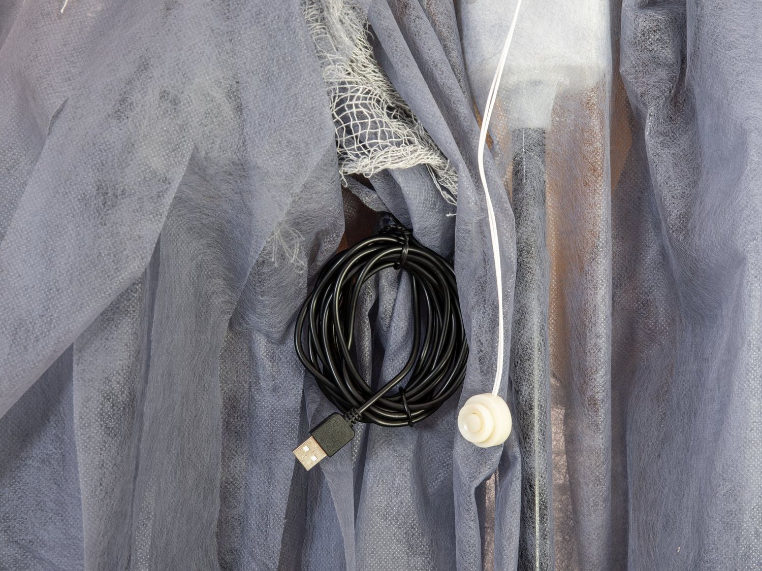- Mit grauem löchrigen Gewand und Flügeln, skelettiertes Gesicht mit grinsenden Mund, tiefliegenden Augen mit rot blinkenden LEDs, der Brustkorb mit den freiliegenden Rippen ragt aus einem großen Loch im Stoff hervor, welcher mit grün blinkenden LEDs gruselig in Szene gesetzt wird