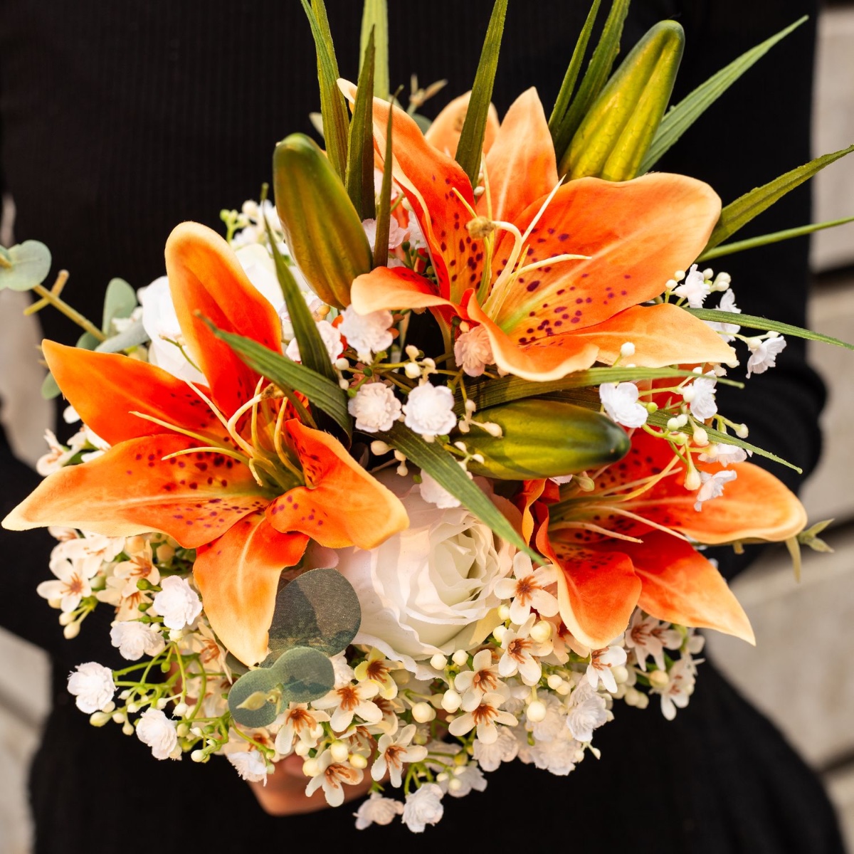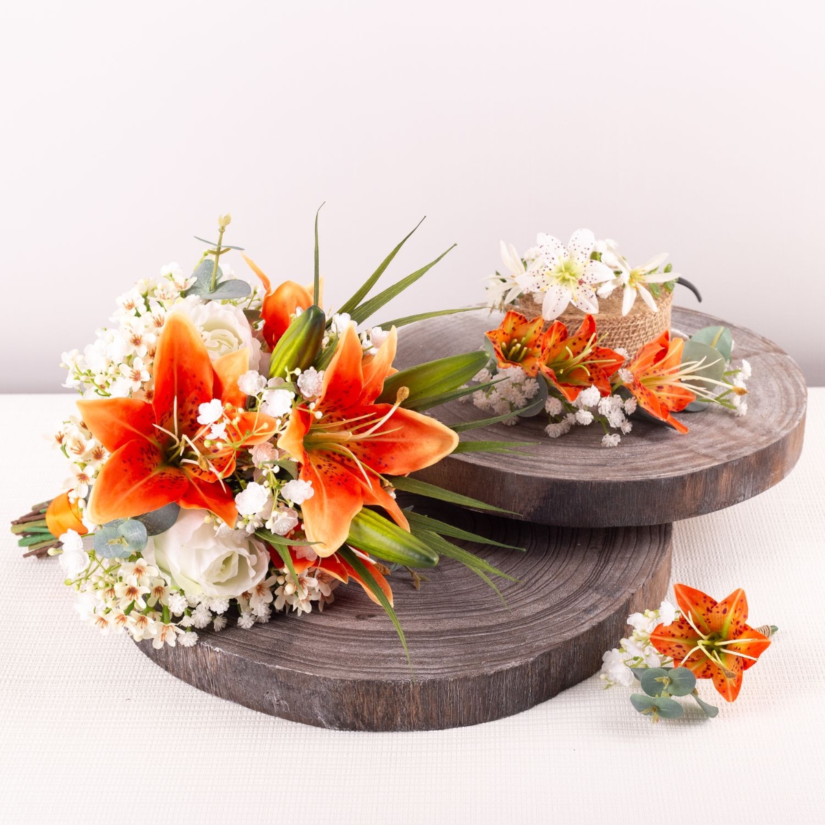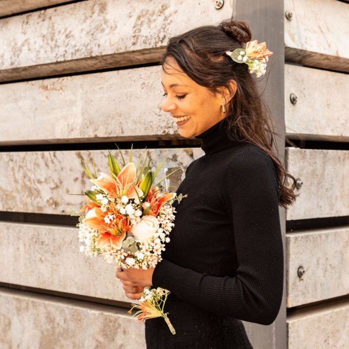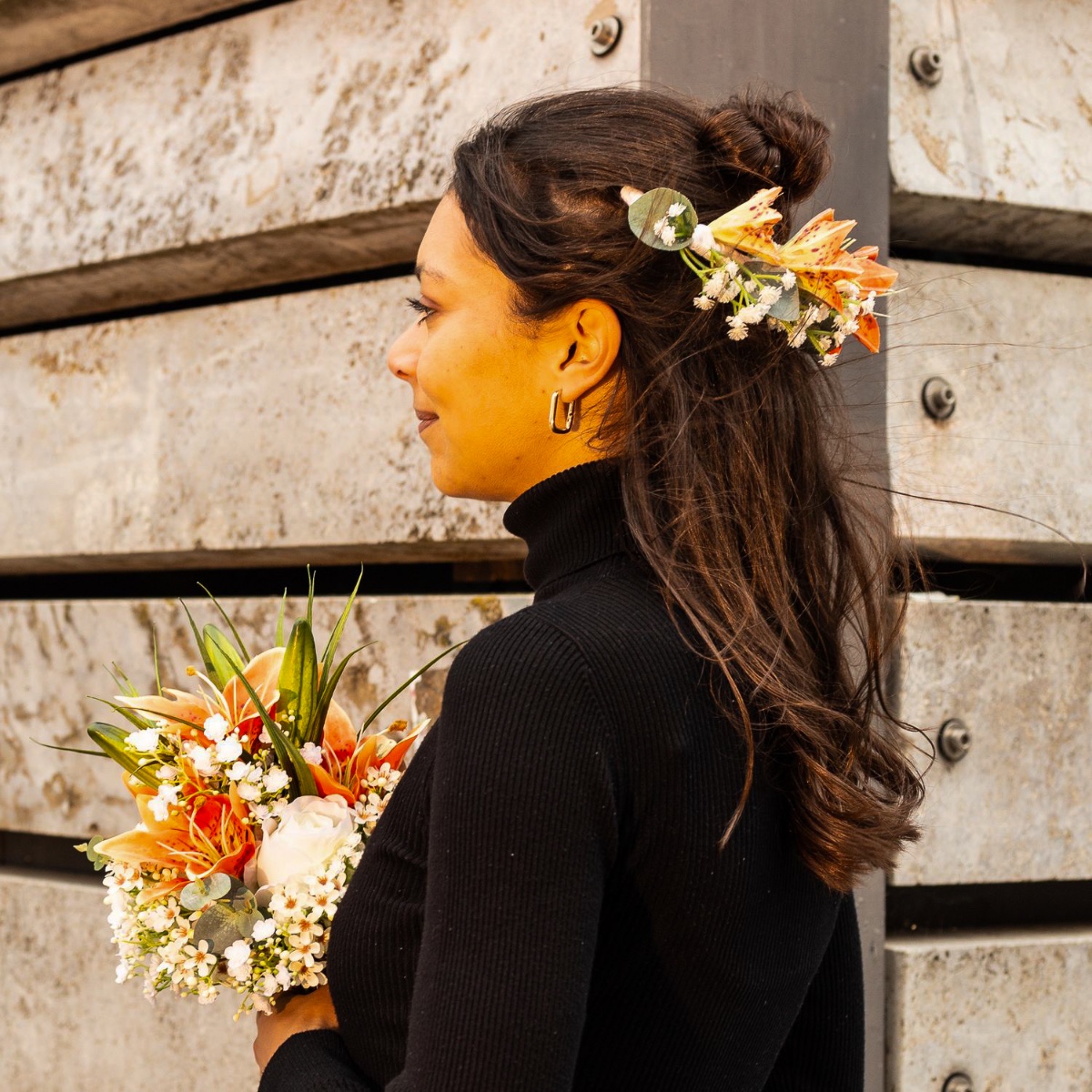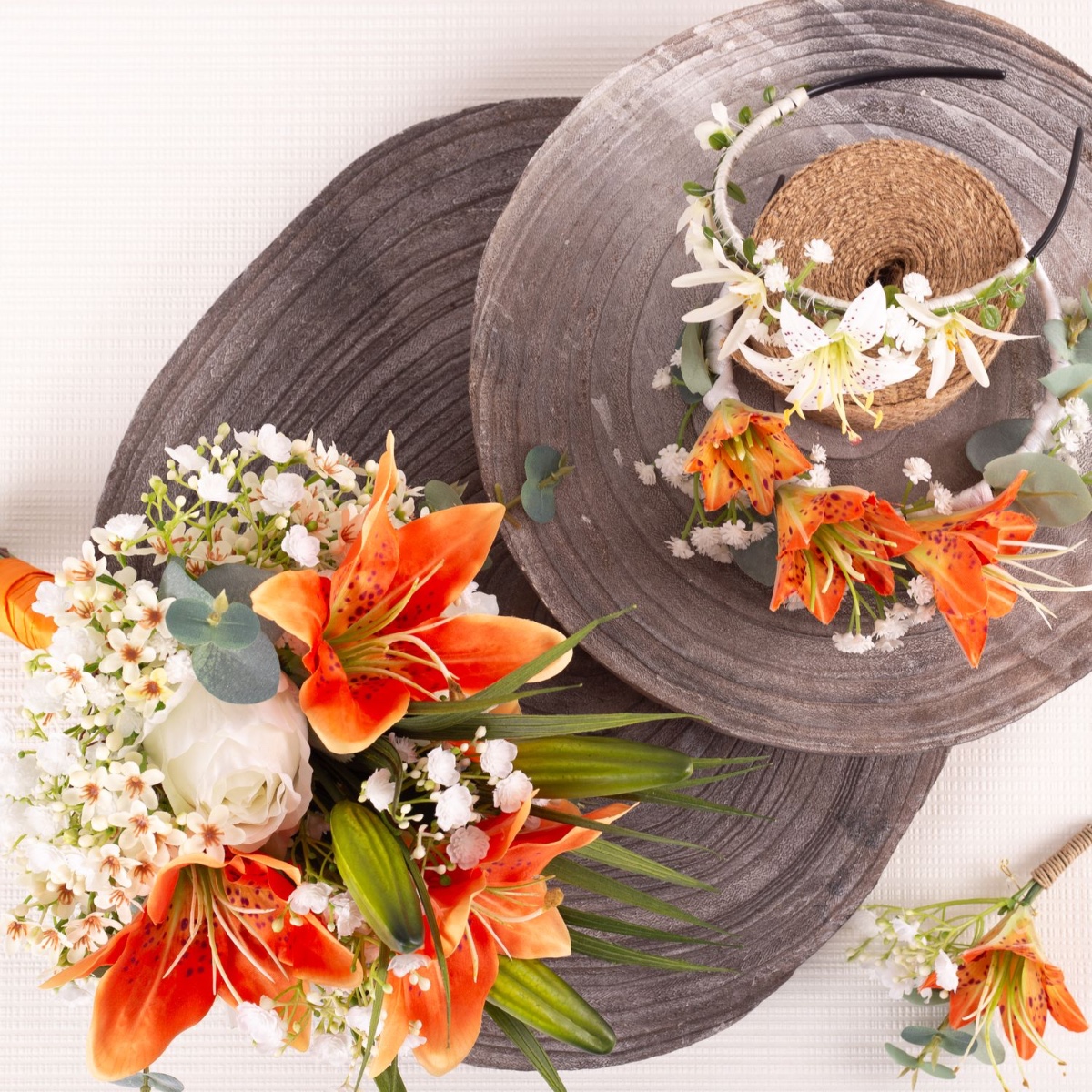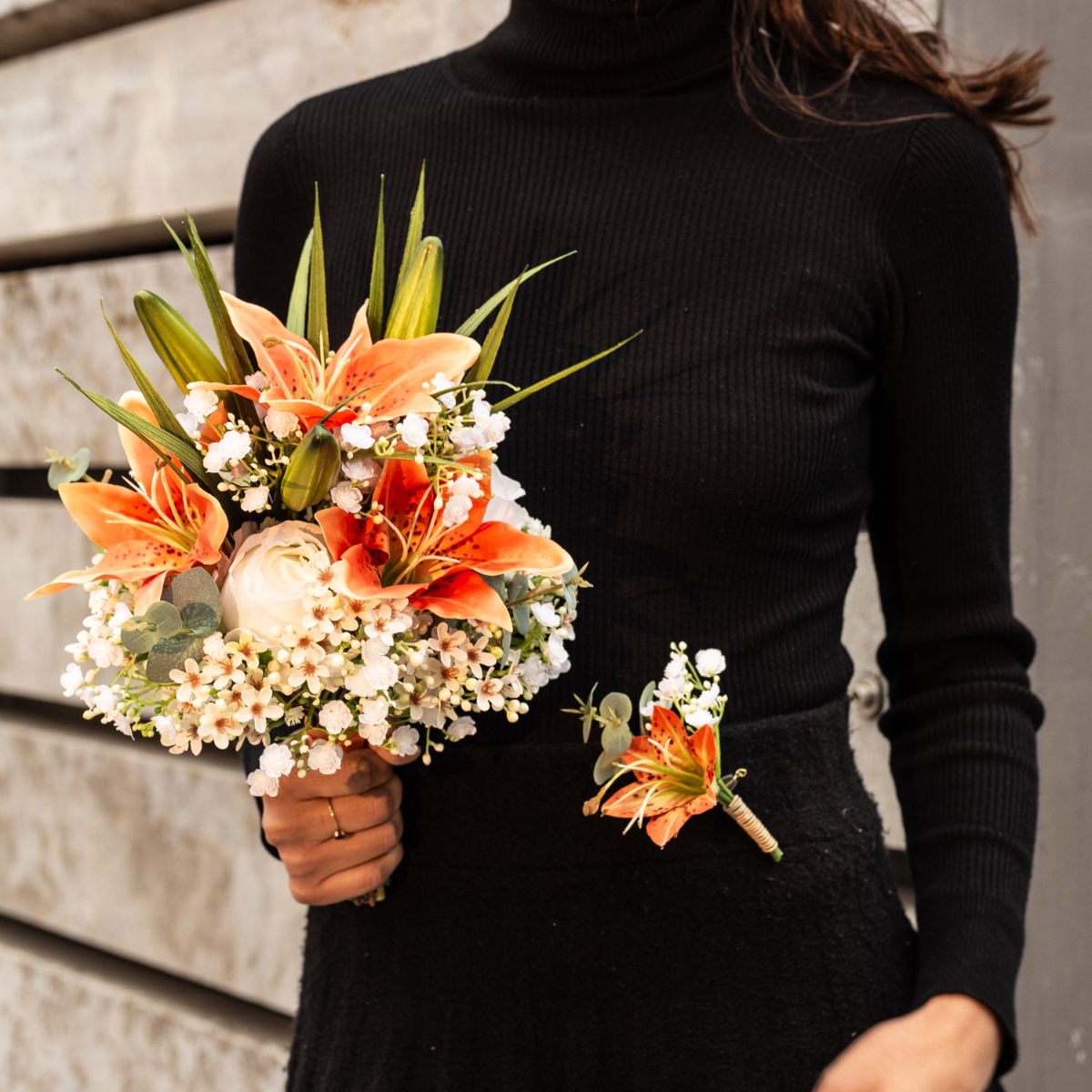 Orange und Weiß! Orange Lilien aus der Serie EMIKO mussten es für Tamaras Brautstrauß einfach sein. Diese leuchtenden Textilblumen sind nicht nur wunderschön, sie haben auch eine passende Bedeutung für eine Hochzeit. Denn die orangefarbene Lilienblüte symbolisiert Leidenschaft, Glück und Freude. Außerdem haben sie eine faszinierende Blüte, die jeden Strauß elegant erscheinen lässt. Den passenden Haarschmuck in Form von Haarreifen für Tamara selbst und ihre Trauzeugin sowie ein passender Anstecker für den Mann hat unser Kreativteam auch gemacht. Eine perfekte Kombination für diesen besonderen Anlass. Shop the Look!