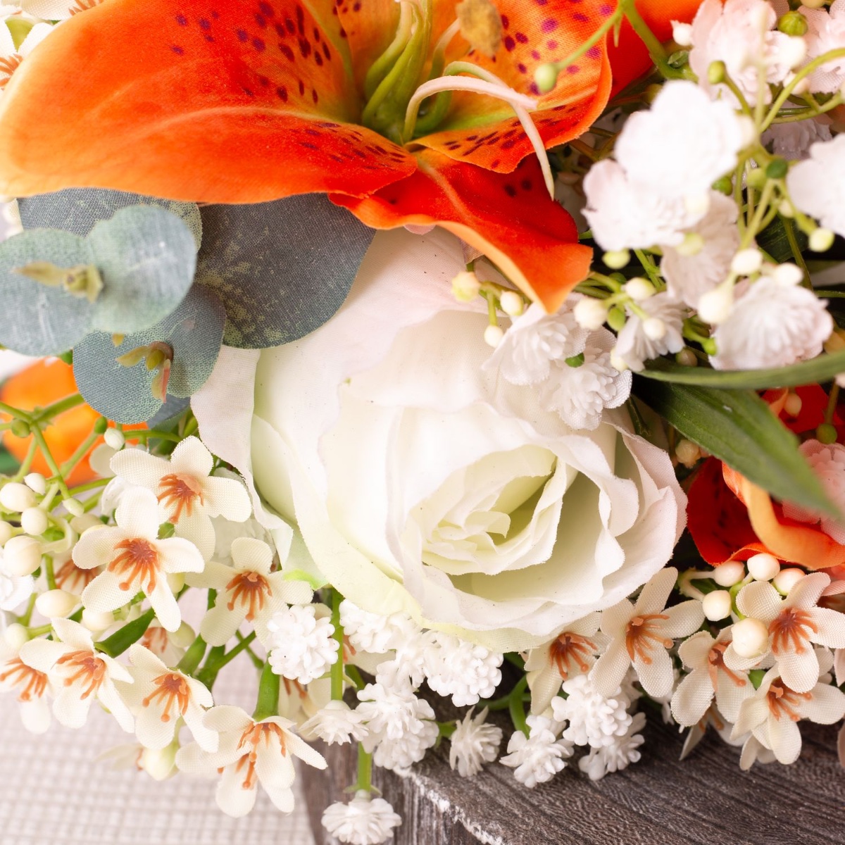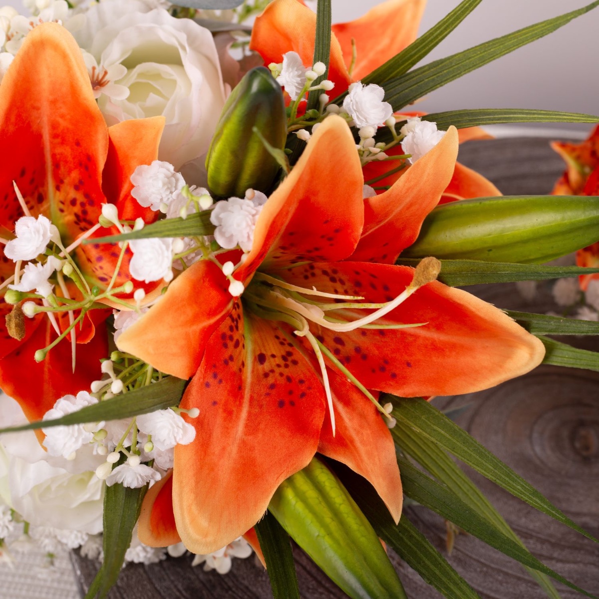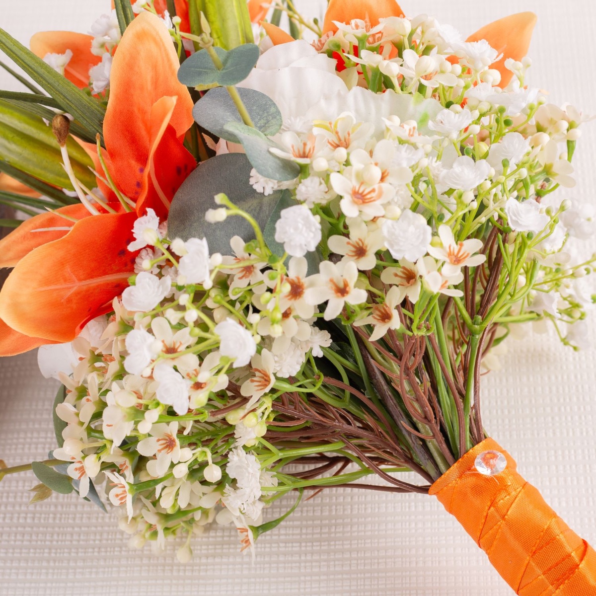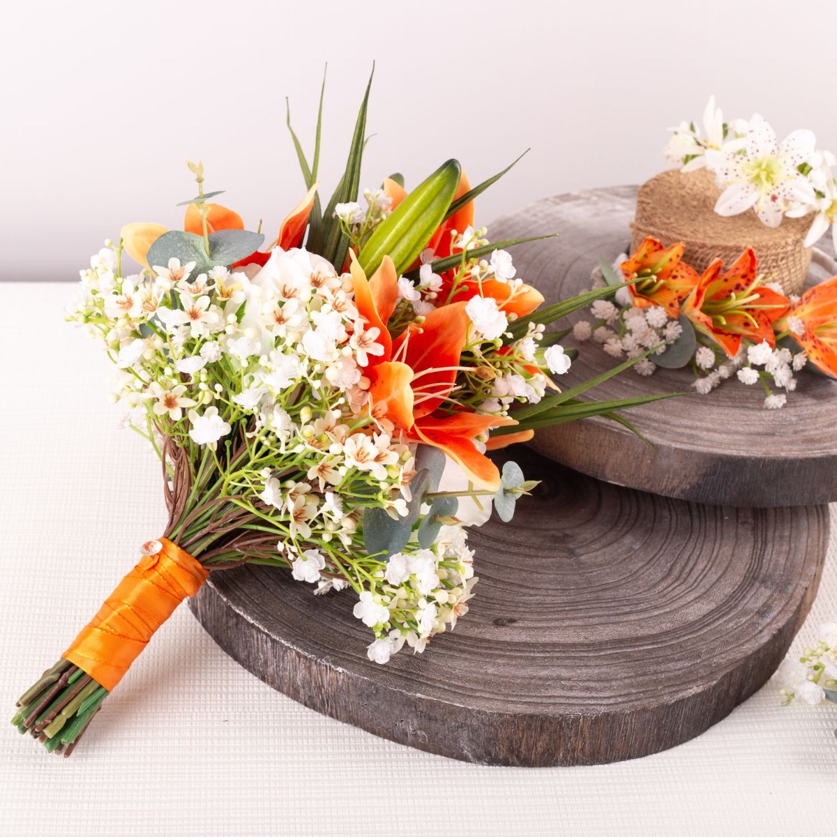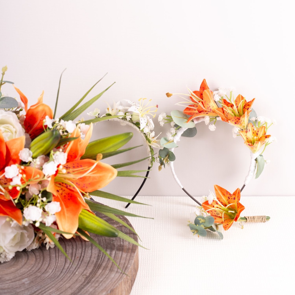 Orange und Weiß! Orange Lilien aus der Serie EMIKO mussten es für Tamaras Brautstrauß einfach sein. Diese leuchtenden Textilblumen sind nicht nur wunderschön, sie haben auch eine passende Bedeutung für eine Hochzeit. Denn die orangefarbene Lilienblüte symbolisiert Leidenschaft, Glück und Freude. Außerdem haben sie eine faszinierende Blüte, die jeden Strauß elegant erscheinen lässt. Den passenden Haarschmuck in Form von Haarreifen für Tamara selbst und ihre Trauzeugin sowie ein passender Anstecker für den Mann hat unser Kreativteam auch gemacht. Eine perfekte Kombination für diesen besonderen Anlass. Shop the Look!