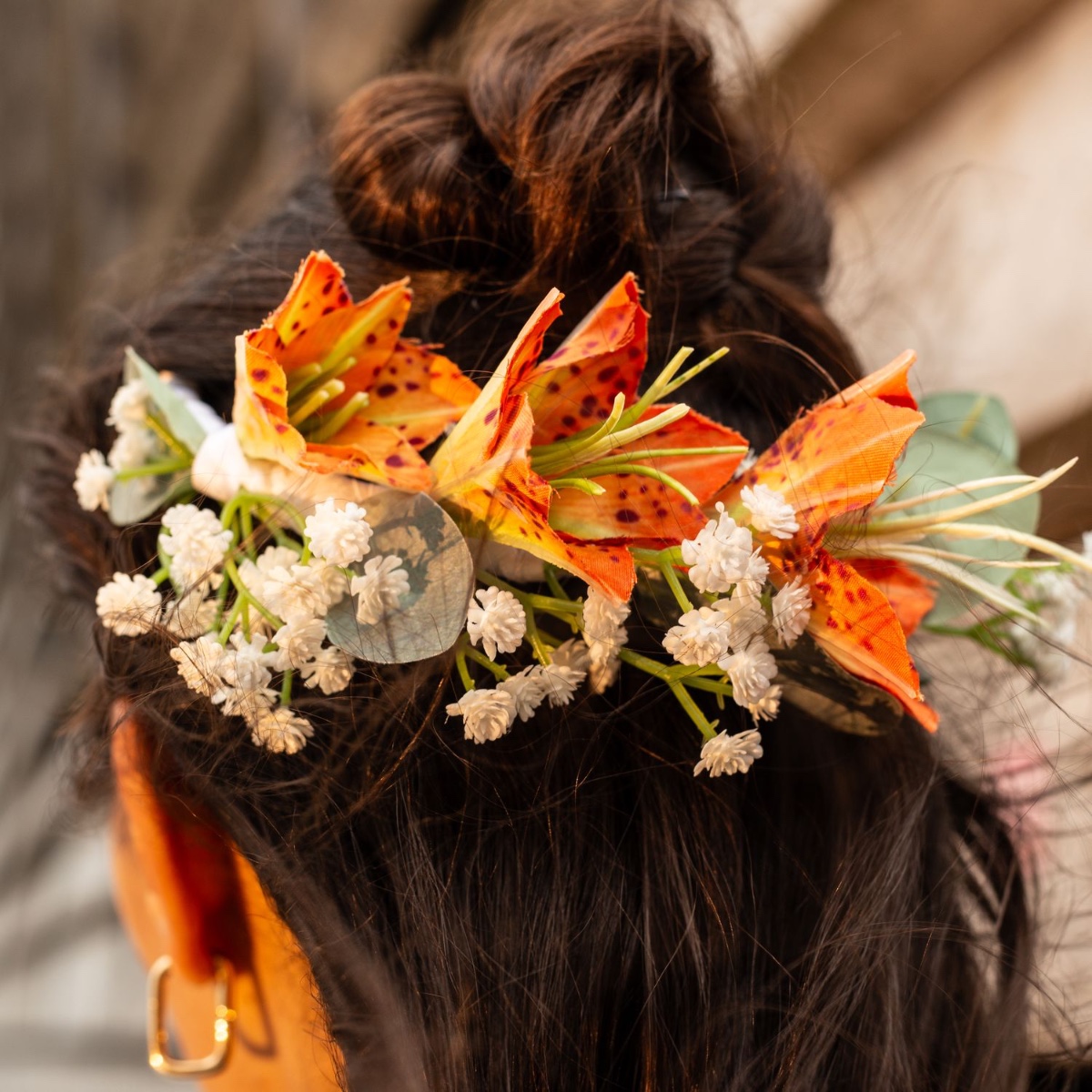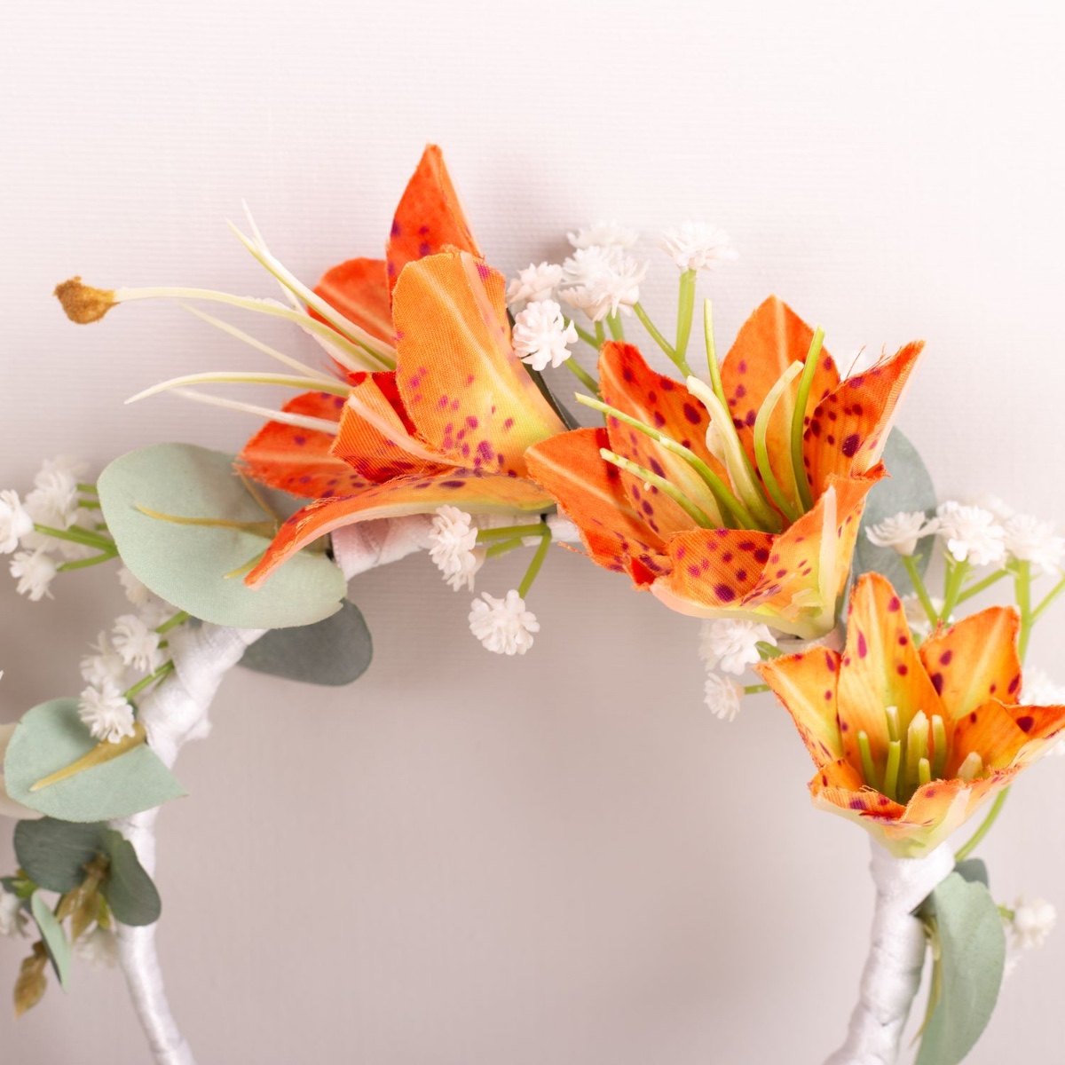 Haarreif Braut, Lilie orange:Die Lilien haben wir zuerst mit einer Schere in 3 unterschiedliche Größen zurechtgeschnitten. Danach wurden diese mit Heißkleber auf dem Haarreif befestigt. Die Blüten sollten so angeordnet sein, dass sie nach vorne bzw. oben zeigen. Zusätzlich haben wir diese mit Nähgarn fixiert. Genauso wird dann mit dem Schleierkraut und dem Eukalyptus verfahren. Zum Schluss nimmt man ein 0,5 cm breites Satinband und umwickelt den Haarreif, sodass die geklebten Stiele nicht mehr sichtbar sind. Dieses auch immer wieder mit Heißkleber fixieren.