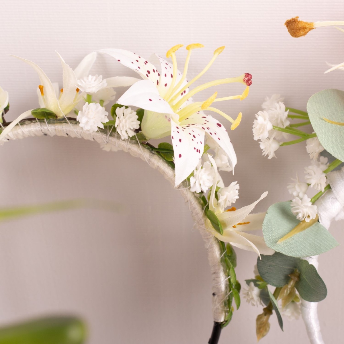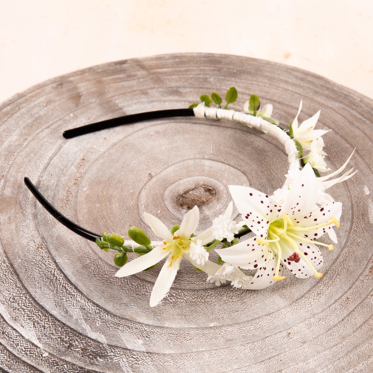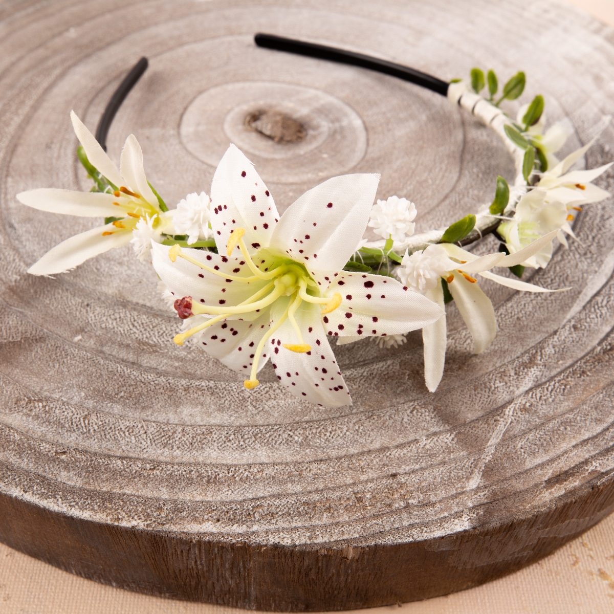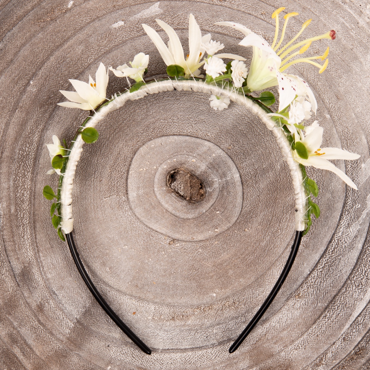 Haarreif Trauzeugin, Lilie weiß: Bei dieser Variante haben wir das Satinband zuerst um den Haarreif gewickelt. Die Blüten und Blätter wurden zuerst mit ein wenig Heißkleber fixiert und danach mit Nadel und Faden genäht. Das hat den Vorteil, dass auch kleine Teile für den Haarschmuck verwendet werden können. Auch z.B. Perlen lassen sich so leicht in den Haarreif einarbeiten.