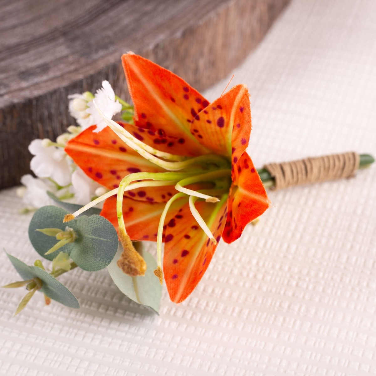 Bräutigam Anstecker: Aus ein paar Resten kann der Anstecker für den Mann ganz einfach zusammengestellt werden. Auch hier die Lilie zuerst wieder auf die gewünschte Größe zurechtschneiden. Danach kann das kleine Sträußchen mit einem Papier umwickelten Draht auf der Anstecknadel befestigt werden.