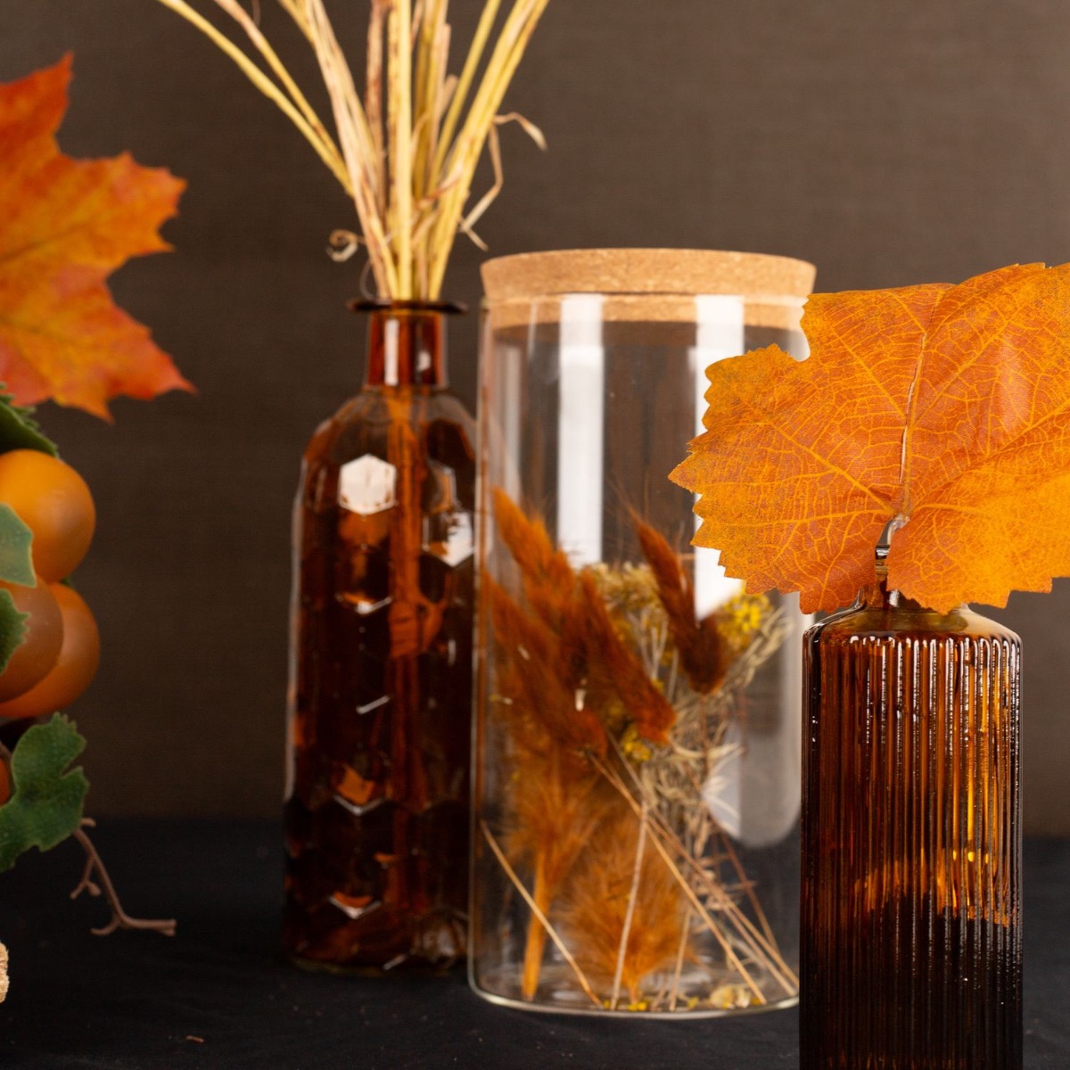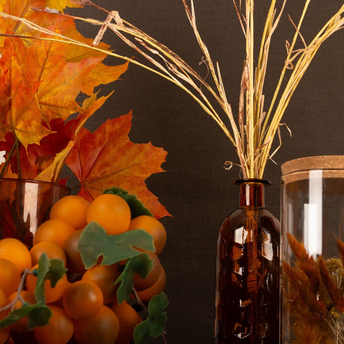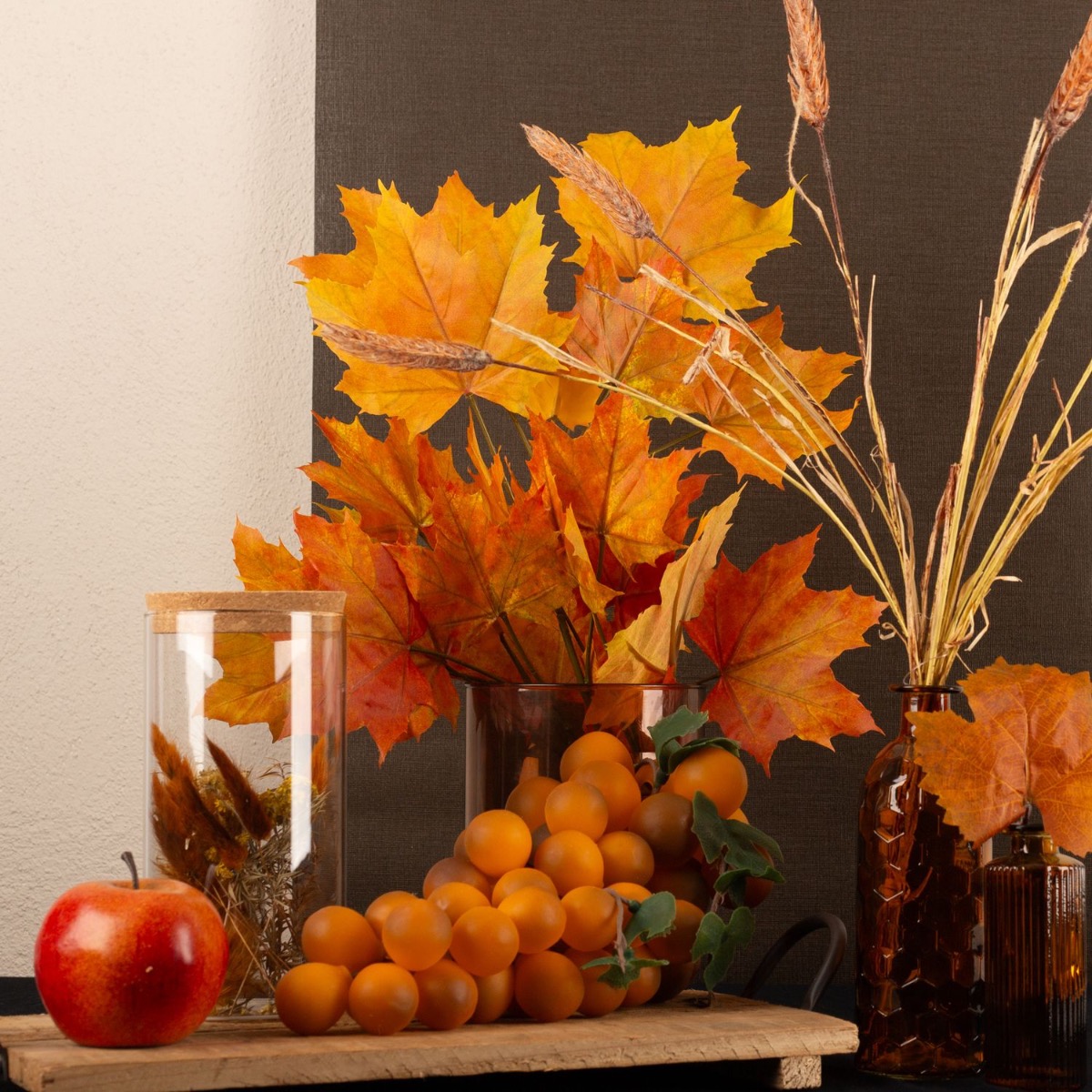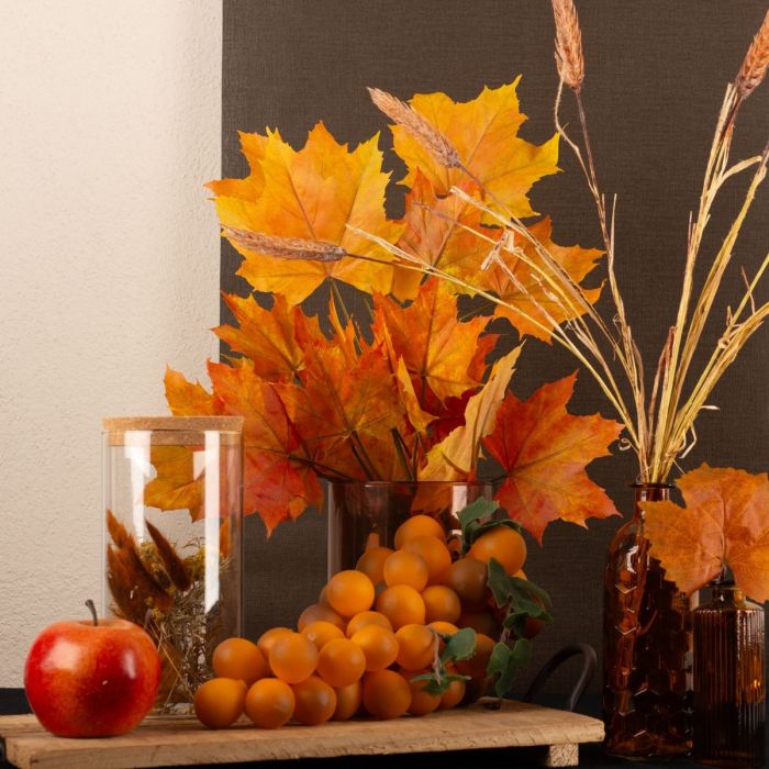 Braun und Orange! Das sind klassische Herbstfarben. Vor allem die Ahornblätter bringen im Herbst besonders schöne Farben hervor. Das Orange leuchtet zauberhaft und bringt den Herbst in Ihr Zuhause. Das Vorratsglas, das mit herbstlichen Trockenblumen gefüllt ist, passt einfach super zu diesem Herbstlook. Die Weizenähren, der rote Apfel und die orangefarbenen Trauben erinnern an die bevorstehende Erntezeit. In unserem Sortiment an Flaschen und Vasen finden sich etliche Produkte in Braun und Orange. Shop the Look!