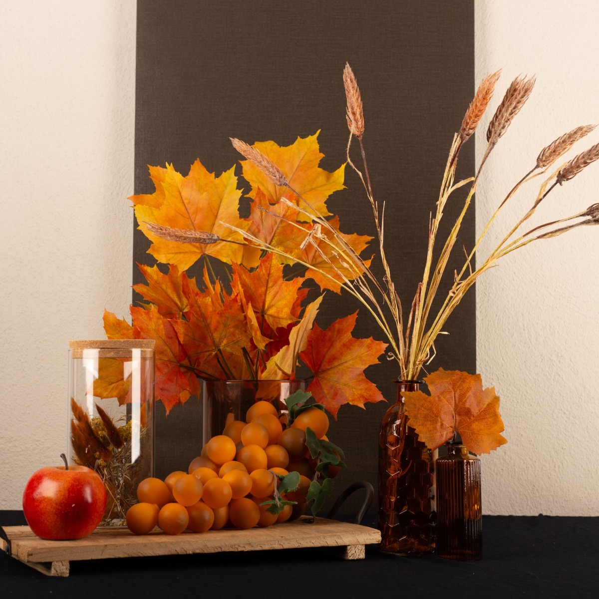 Gestaltungstipp: Den Ahornzweig und den Weizenährenzweig auf Vasengröße zuschneiden und in der Vase schön auffächern. In die kleine Vase aus der Serie EMANUELA haben wir einfach ein Blatt vom Ahornzweig abgetrennt und in die Flasche gesteckt. Auf das Holztablett wurden die Trauben und der Apfel gelegt. Da möchte man doch gleich reinbeißen.