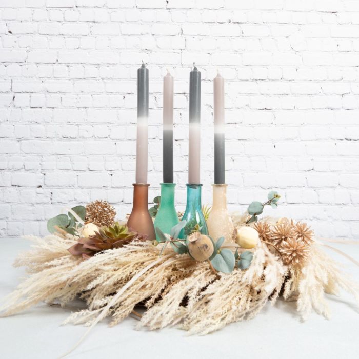 Gestaltungstipp: Das Pampasgras vom Kranz schön zurechtlegen. Die Dekozweige kürzen und in den Kranz stecken. Dabei auf eine gleichmäßige Verteilung achten. Die Flaschen mit den Kerzen so anordnen, dass die Dip-Dye Kerzen farblich abgewechselt werden.