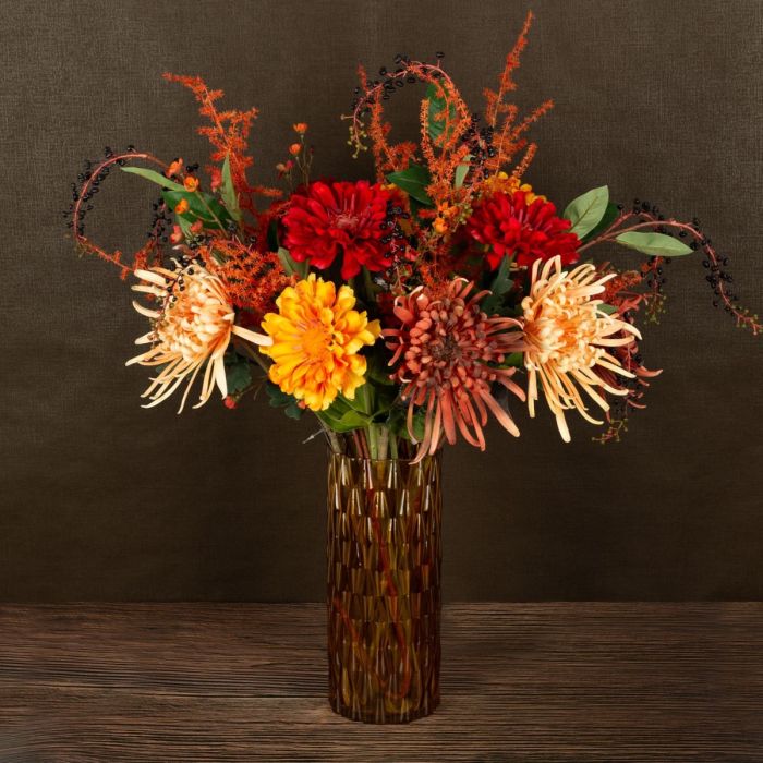 Von Apricot bis Dunkelrot! Diese feurigen Farben bringen Wärme und Licht in den kühlen und dunklen Herbst. Typische Spätsommerblumen wie Chrysanthemen und Zinnien, die mit ihren vielfältigen Rot und Orangetönen kombiniert wurden, wirken vor dem dunklen Hintergrund fast wie ein Ölgemälde aus dem Impressionismus. Erhellen Sie Ihr Zuhause mit diesem klassisch schönen Stillleben. Shop the Look!