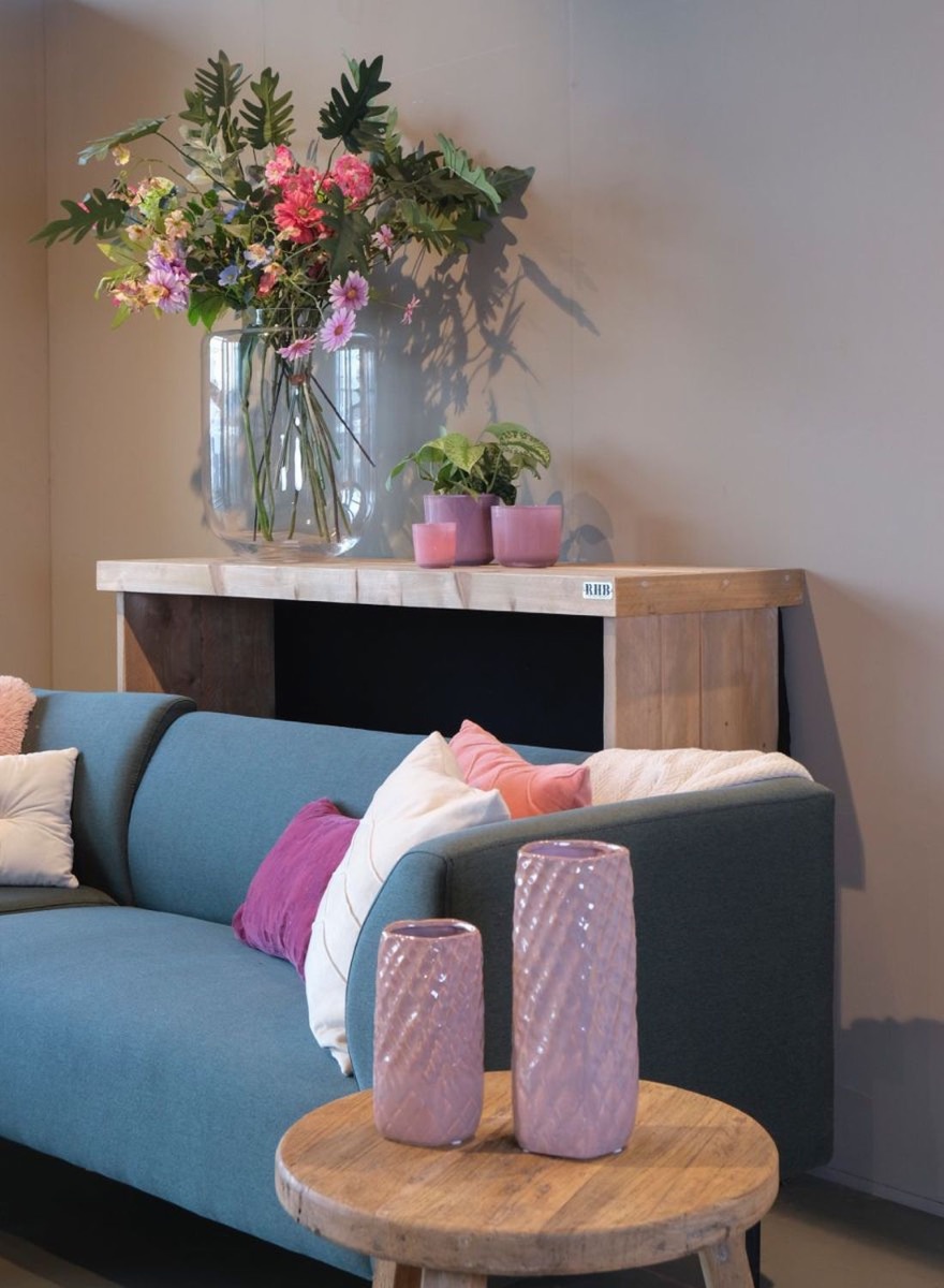 Die Blumenvase DAVINE mit der strukturierten Oberfläche unterstreicht bestens die Schönheit eines bunten künstlichen Blumenstraußes.