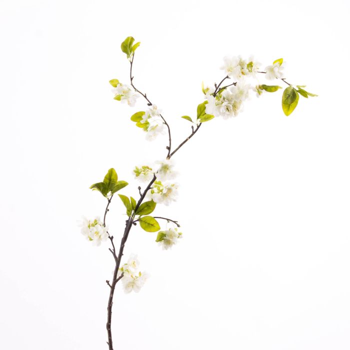 Schöner Deko Zweig VALESKA mit vielen Textilblüten in Farbe weiß für eine elegante Frühlingsdekoration. Der künstliche Blumen Zweig ist insgesamt ca. 115 cm lang und ideal für Bodenvasen in Eingangshallen oder als Schaufesterdekoration.