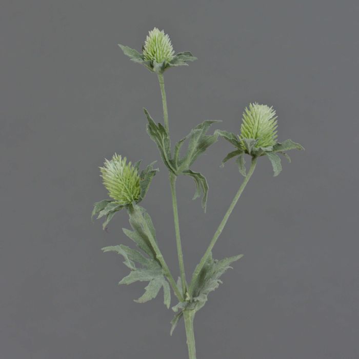 Deko Zweig SVEA mit 3 Disteln in Farbe grün. Die künstliche Edeldistel (Eryngium) hat eine Gesamtlänge von ca. 40 cm und Blätter in detailgetreuer Optik.