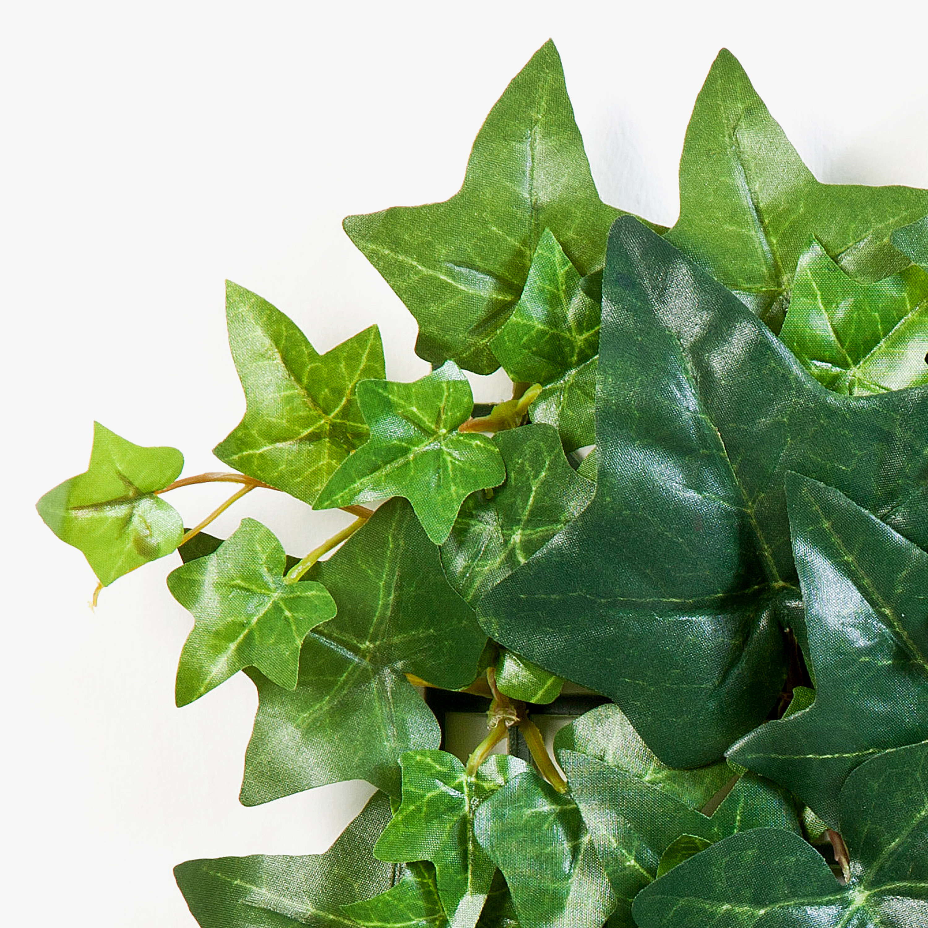 Die künstliche Efeumatte LUKA hat verschiedengroße grüne Blätter und eine quadratische Form. Die Kunst Efeumatte hat die Gesamtgröße ca. 30x30 cm.