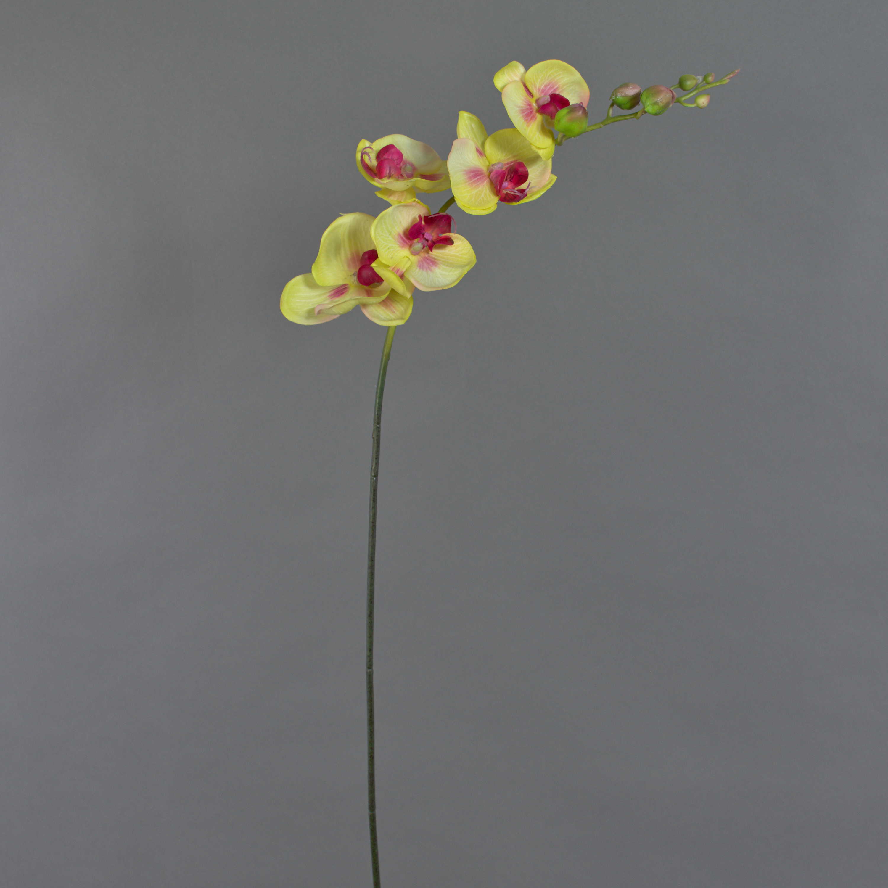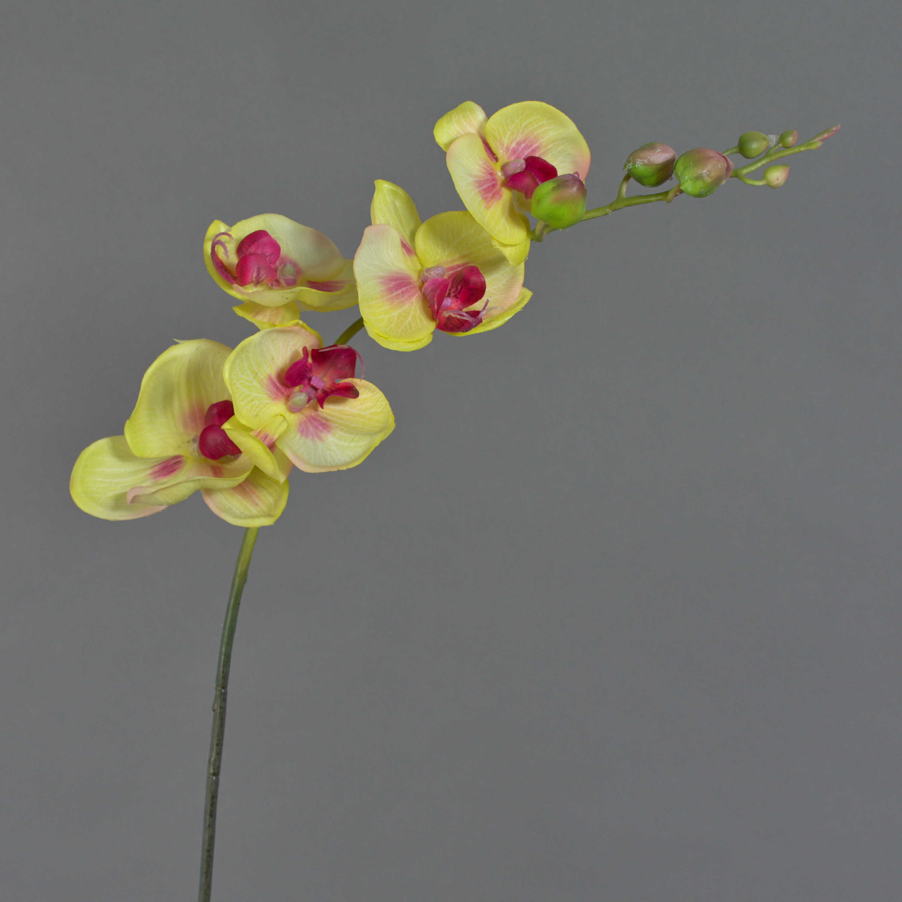 Künstlicher Phalaenopsis Orchideenzweig mit 5 Orchideenblüten in Farbe gelb-pink und 6 Knospen. Der Kunstzweig ist ca. 80 cm lang und sieht nicht nur täuschend echt aus, sondern fühlt sich auch echt an (real touch).