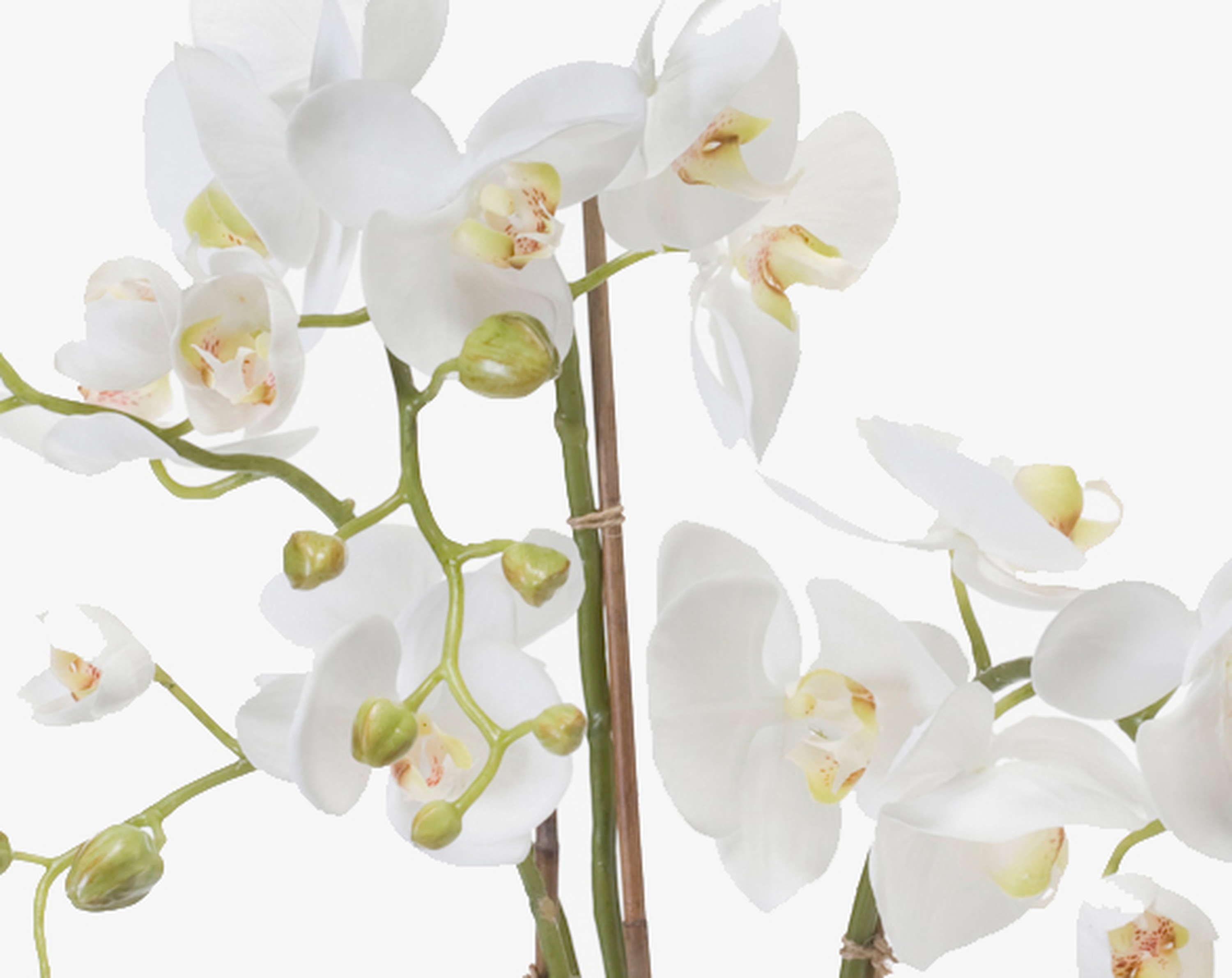 Schöne Phalaenopsis Kunst Orchidee PABLA mit 4 Orchideenzweigen und Orchideenblüten in Farbe weiß-gelb. Die Edle Orchidee hat einen Moosballen mit Luftwurzeln und eine Gesamthöhe von ca. 80 cm.