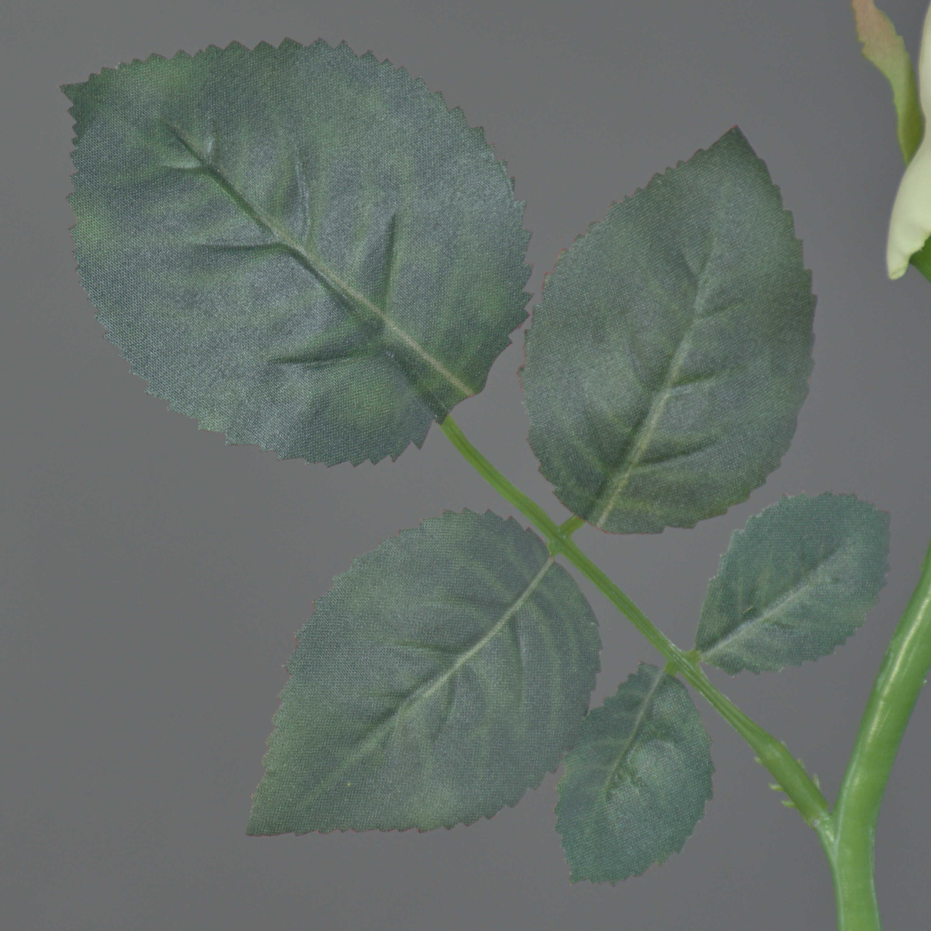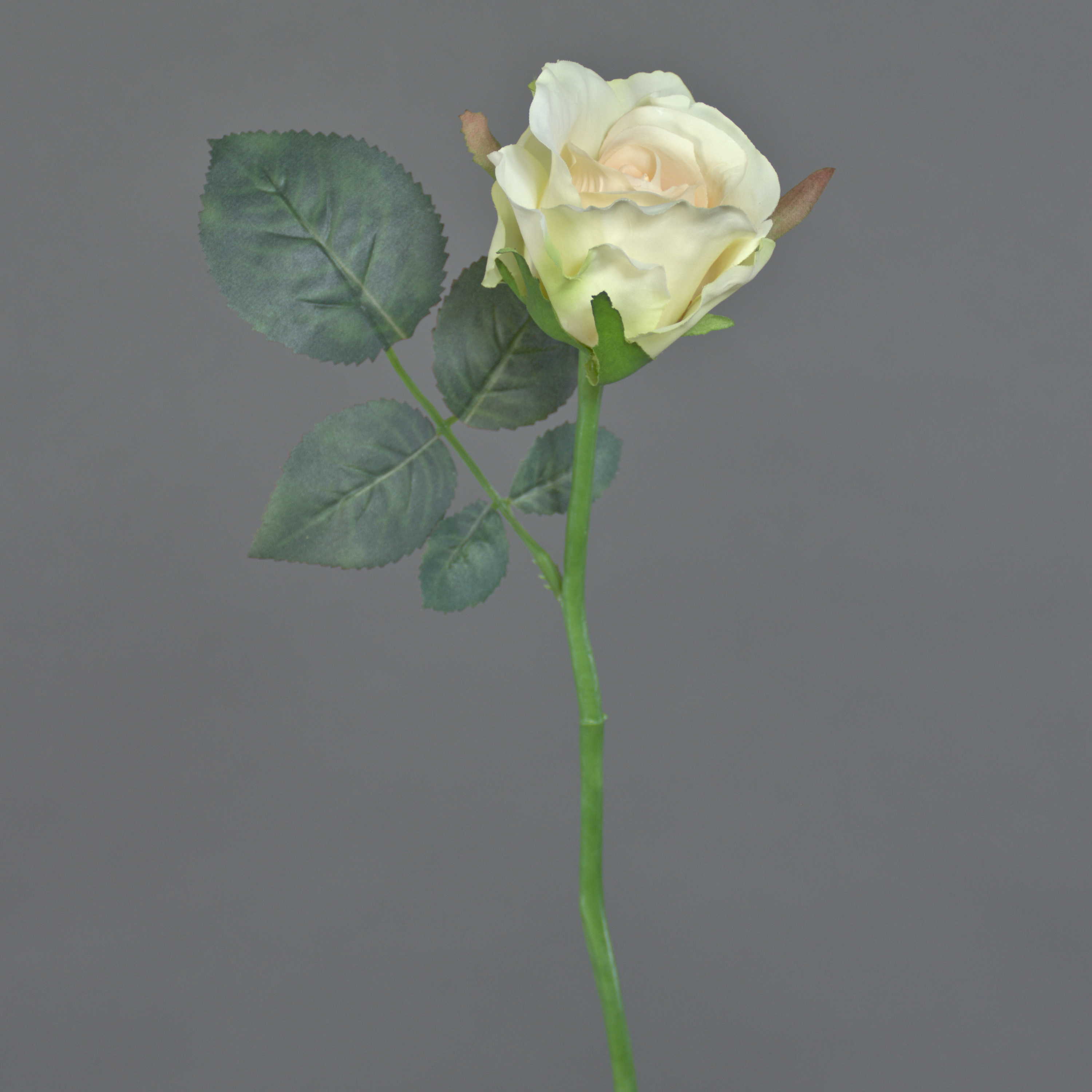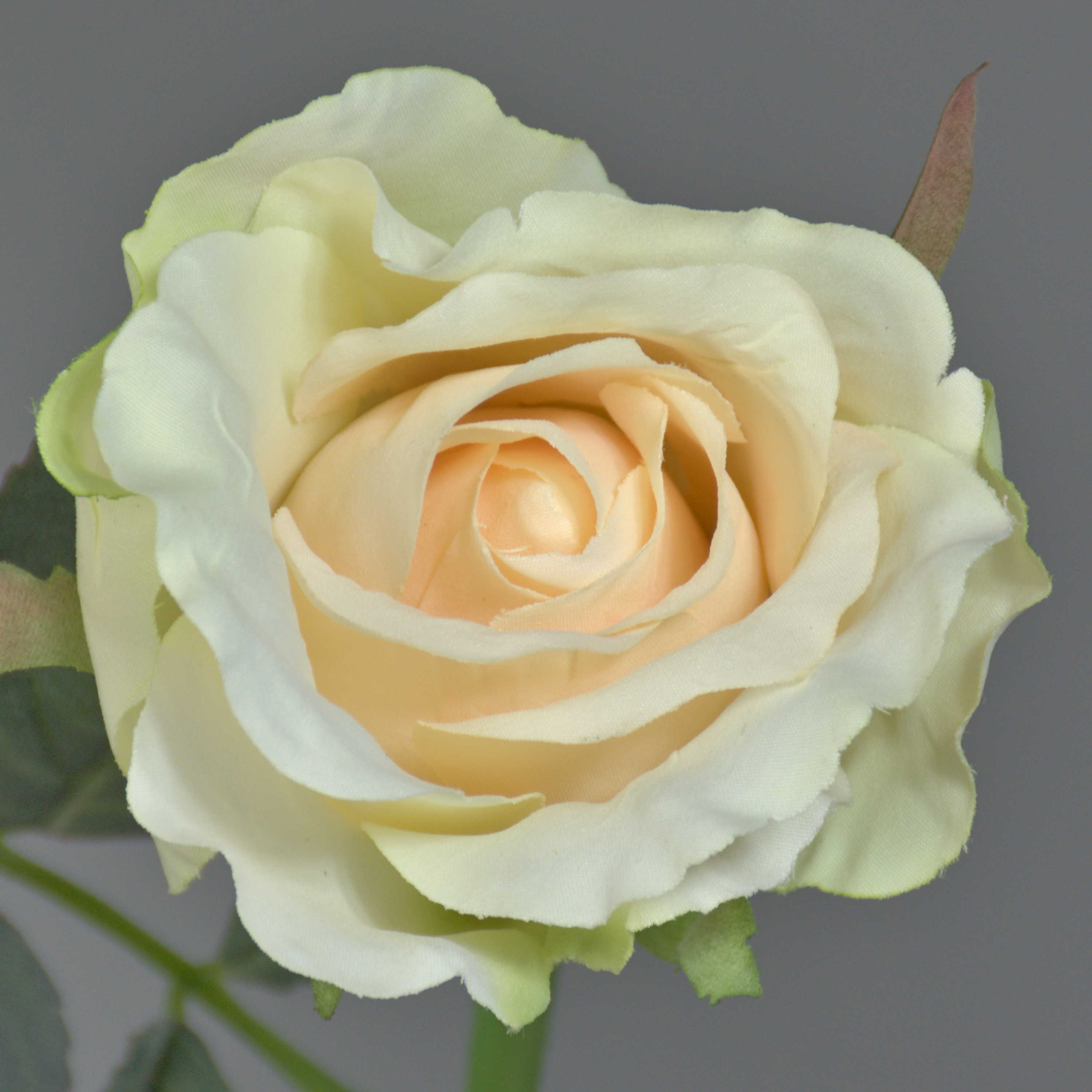 Schöne Kunstrose ELLI mit einer creme rosa farbigen Blüte und grünen Blättern aus Textilmaterial. Die künstliche Mini-Rose hat eine Länge von ca. 30 cm und einen Blütendurchmesser von ca. 6,5 cm.