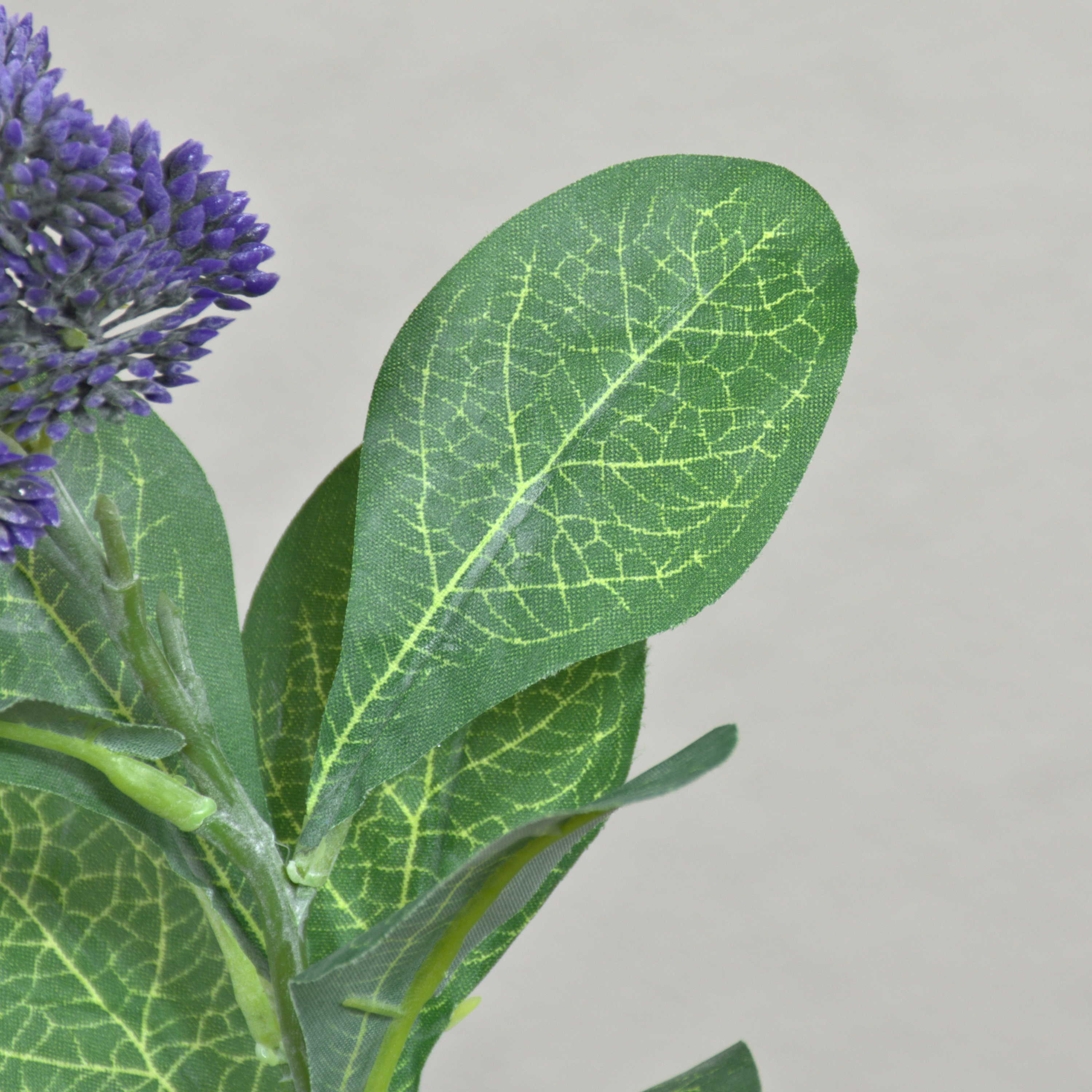 - Die Kunststoff Blüten sind in einer Dolde angeordnet, die Textilblätter haben deutliche Adern und sind am Stiel verteilt angebracht