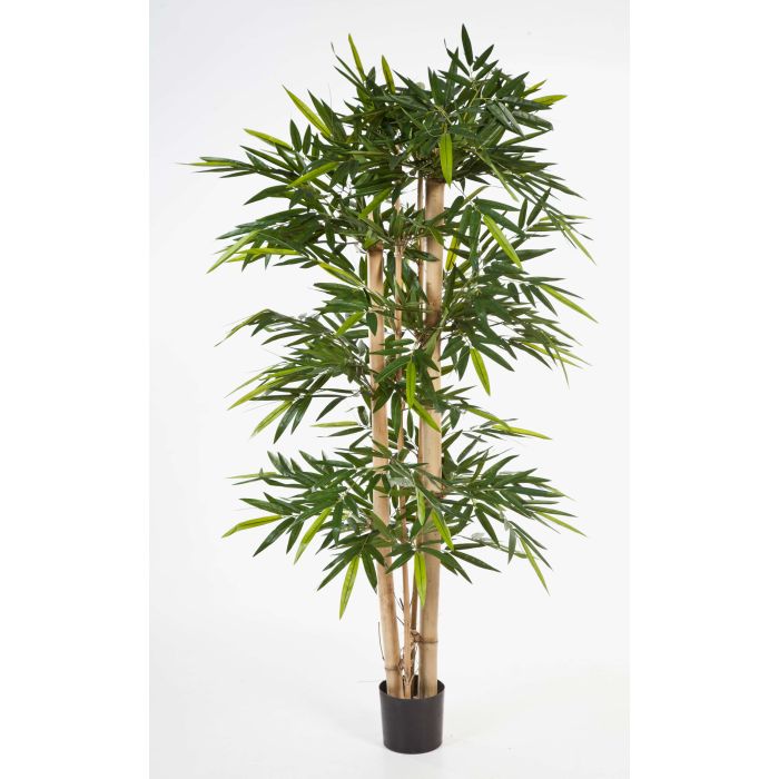 2 dicke Naturholzstämme zusammen mit 2 weiteren, dünneren Rohren lassen den künstlichen Bambus KISHO besonders aussehen. Die Blätter des ca. 150 cm großen Kunst-Bambus haben natürliche Farben und Formen.