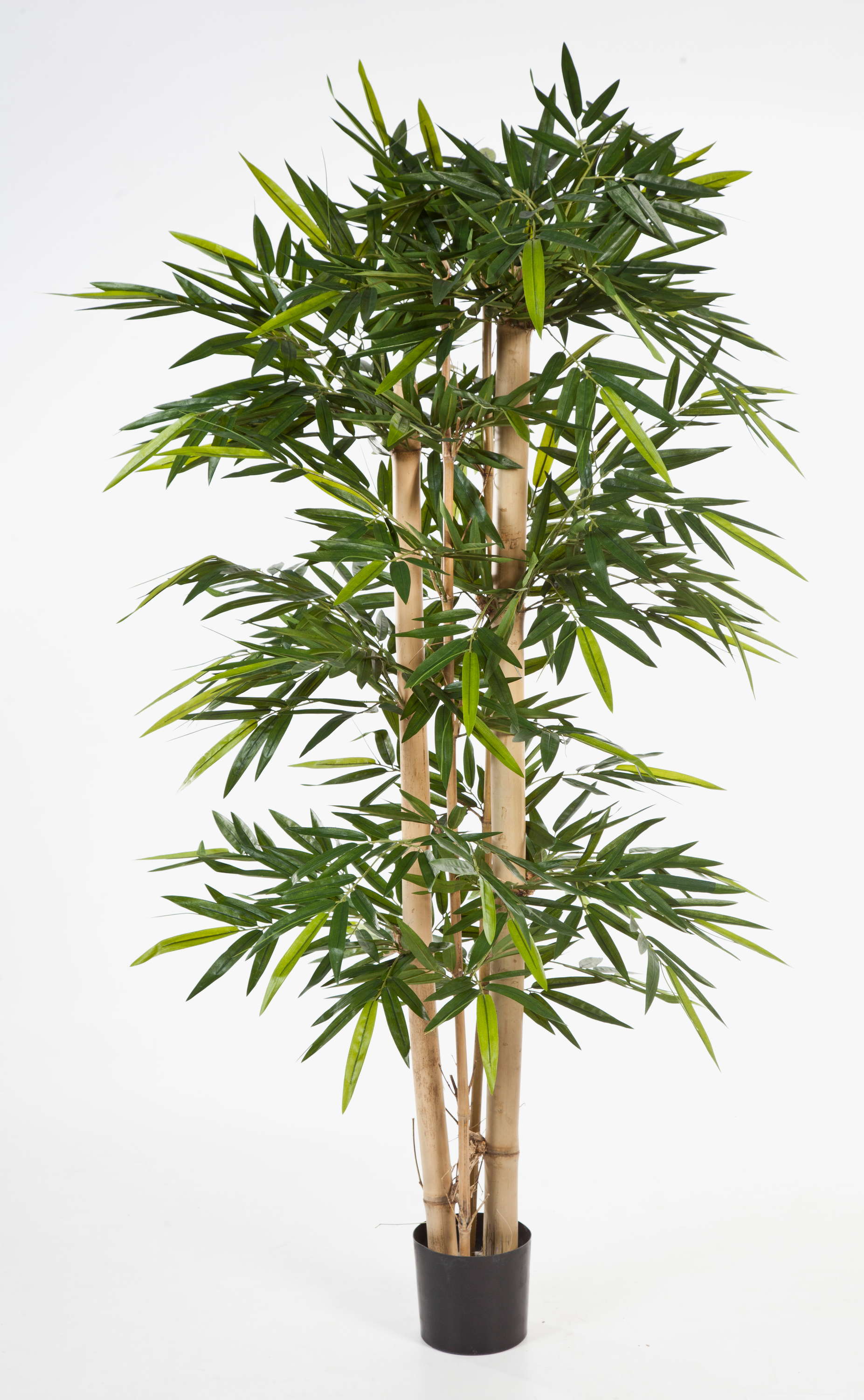 2 dicke Naturholzstämme zusammen mit 2 weiteren, dünneren Rohren lassen den künstlichen Bambus KISHO besonders aussehen. Die Blätter des ca. 210 cm großen Kunst-Bambus haben natürliche Farben und Formen.