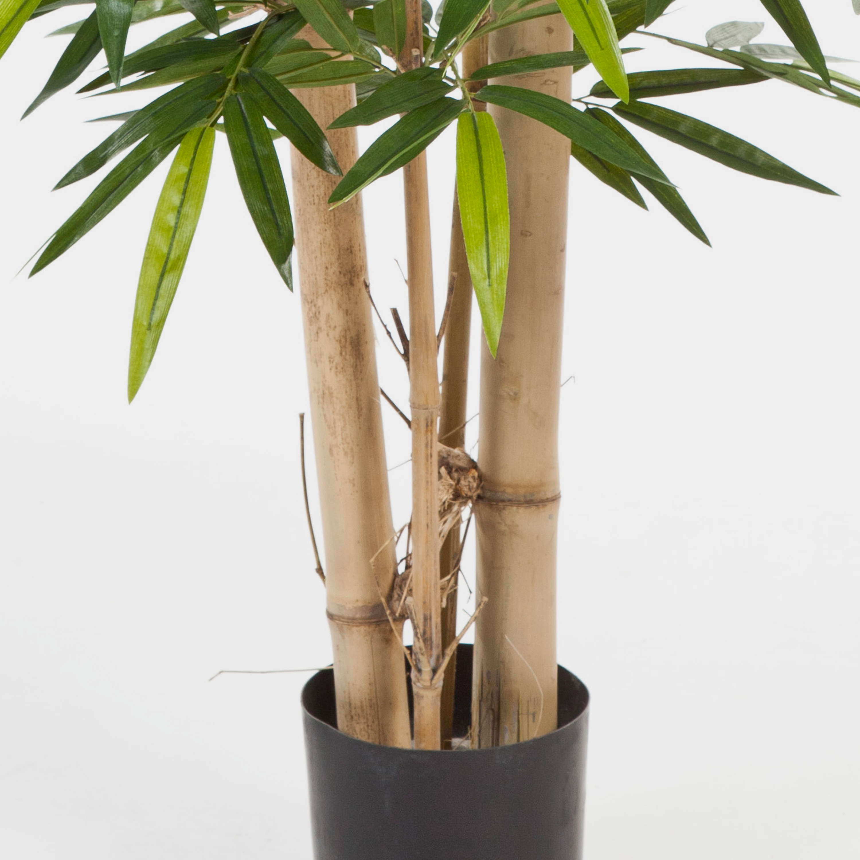 2 dicke Naturholzstämme zusammen mit 2 weiteren, dünneren Rohren lassen den künstlichen Bambus KISHO besonders aussehen. Die Blätter des ca. 240 cm großen Kunst-Bambus haben natürliche Farben und Formen.