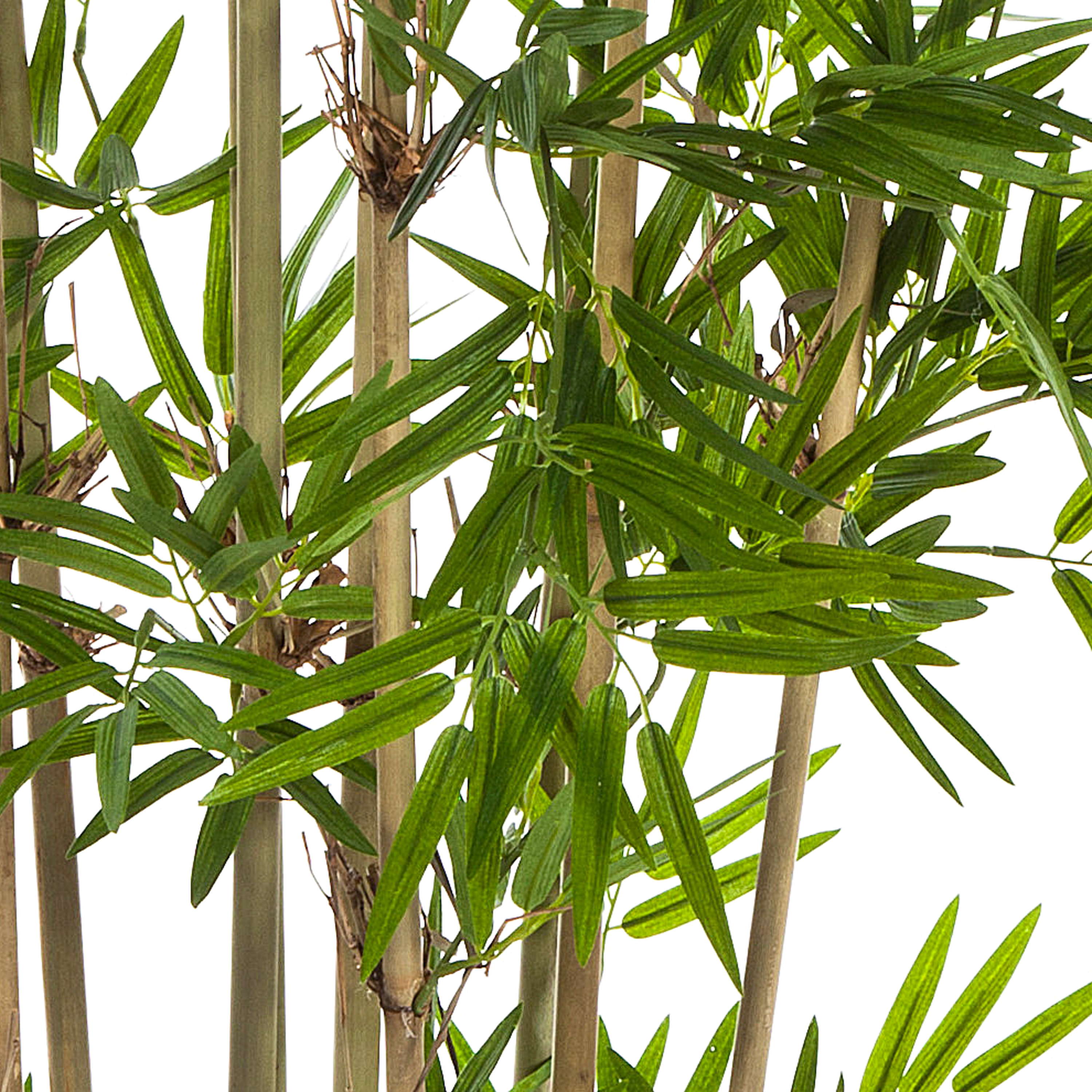 - Buschige Form mit ca. 480 kleinen Textilblättern in grüner Farbe, viele dünne Bambusrohr-Echtstämme