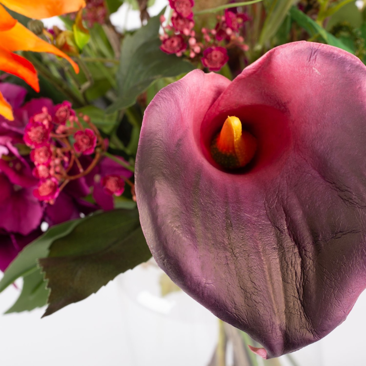 Trübes Wetter und leuchtende Farben. Dieser Blumenstrauß verkörpert den Herbst mit all seinen Facetten. Die leuchtenden Blüten der Hortensie, der Calla und der zwei Dahlien umspielen den verblühten, bräunlichen Bärenklau, das Lampenputzergras und die herbstlichen Weinblätter.