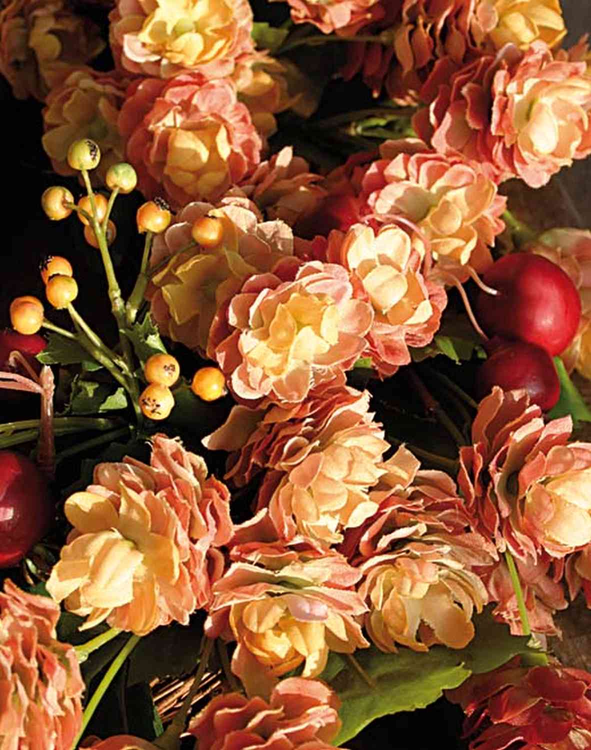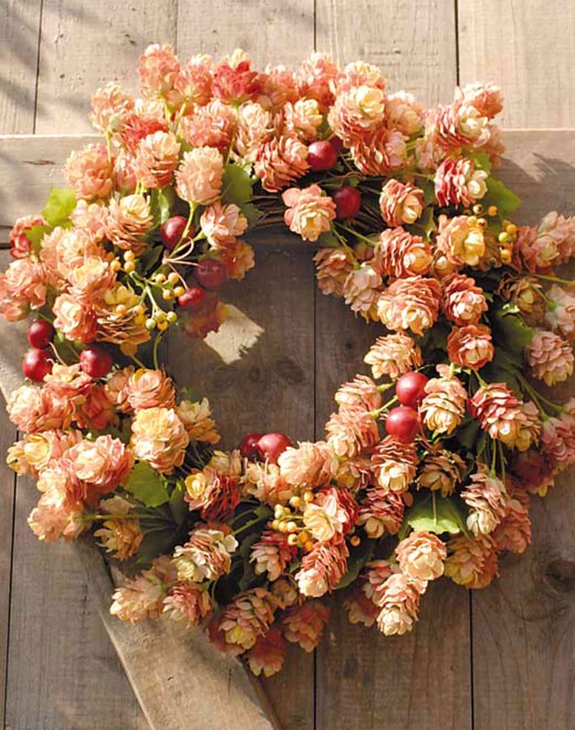 - Grüne Hopfenblüten aus hochwertiger Textilfaser und Ilex-Beeren aus Kunststoff